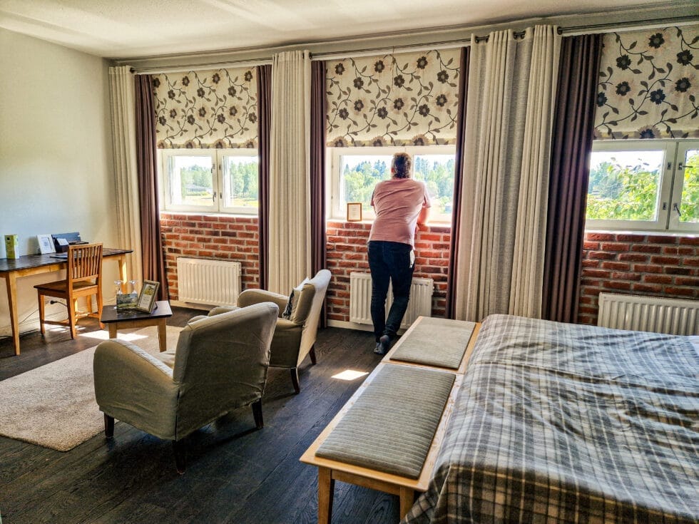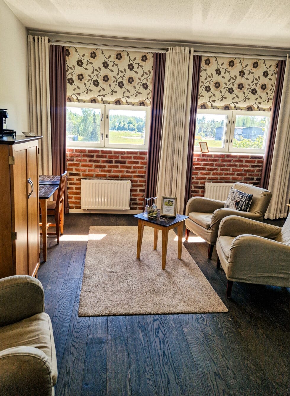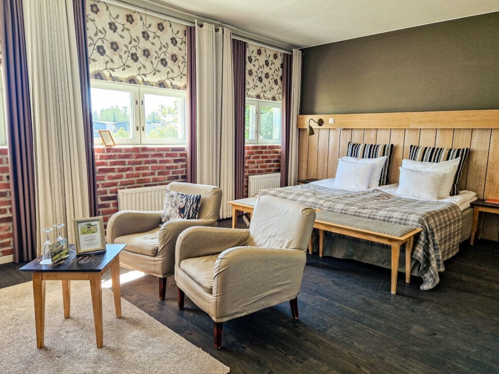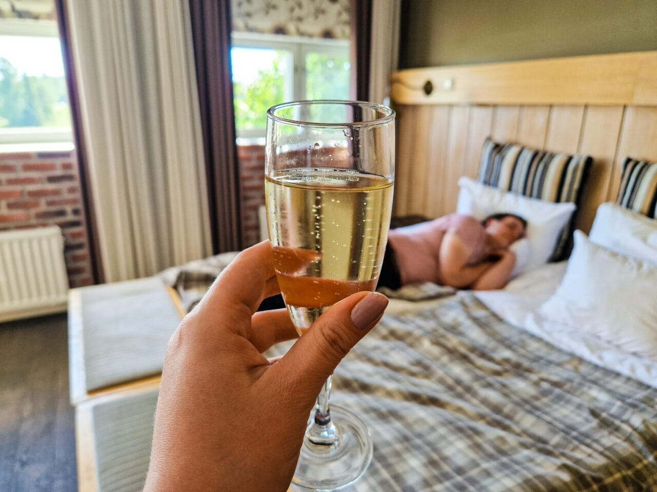 Perille päästyämme meitä odotti aivan IHANA hotellihuone ja siellä skumppapullo jääkaapissa. Hotellihuone oli samanlainen kuin häidemme aikaan ja todella nautimme sen jokaisen yksityiskohdan fiilistelystä, koska se toi mieleen heti ikimuistoiset häämme! Nautimme kuohuvaa ja minä laittauduin samalla, kun Juha hyödynsi tilaisuuden ja otti pienet nokoset. Parasta! Kauniissa Superior-huoneessamme oli tilava eteinen ja oleskelutila sekä iso kylpyhuone ja upea tassuamme! Luksusta vierailuumme toi pehmeät kylpytakit ja tossut, Nespresson kahvinkeitin, iso ja hyvä sänky sekä tietysti pullo skumppaa! Juha haikeana katseli ikkunoista avautuvaa upeaa golf-kenttää ja lupasi, että otamme vierailustamme joka vuotisen tradition, mutta ensi kerralla olemme sen verta pidempään, että hän ehtii käydä pelaamassa! Krapilta löytyy monenlaisia majoitusmahdollisuuksia hotellihuoneista tunnelmalliseen aittamajoitukseen! Kannattaa kurkata huoneista ja muista majoitusvaihtoehdoista tarkemmin täältä!