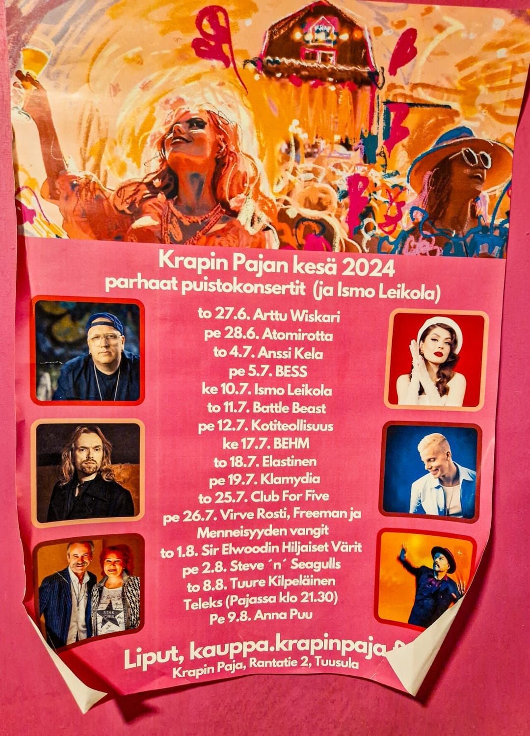 Tuumasta toimeen ja hyvästä ideasta toteutukseen! Luimme ensin Krapin Pajan puistokonserttien esiintyjätarjontaa ja mietimme, että milloin voisimme lähteä reissuun. Seinäjoelta on kuitenkin hiukan matkaa Tuusulaan saakka. Kesämme on täynnä töitä ja lisäksi meillä on häitä ja muita aktiviteetteja jo kalenterissa, niin päädyimme valikoimaan ajankohdaksi Arttu Wiskarin konsertin 27.6 eli viime viikon torstaina. Kesällä on tulossa vaikka mitä hyviä esiintyjiä, voit kurkata tarjonnan tästä!