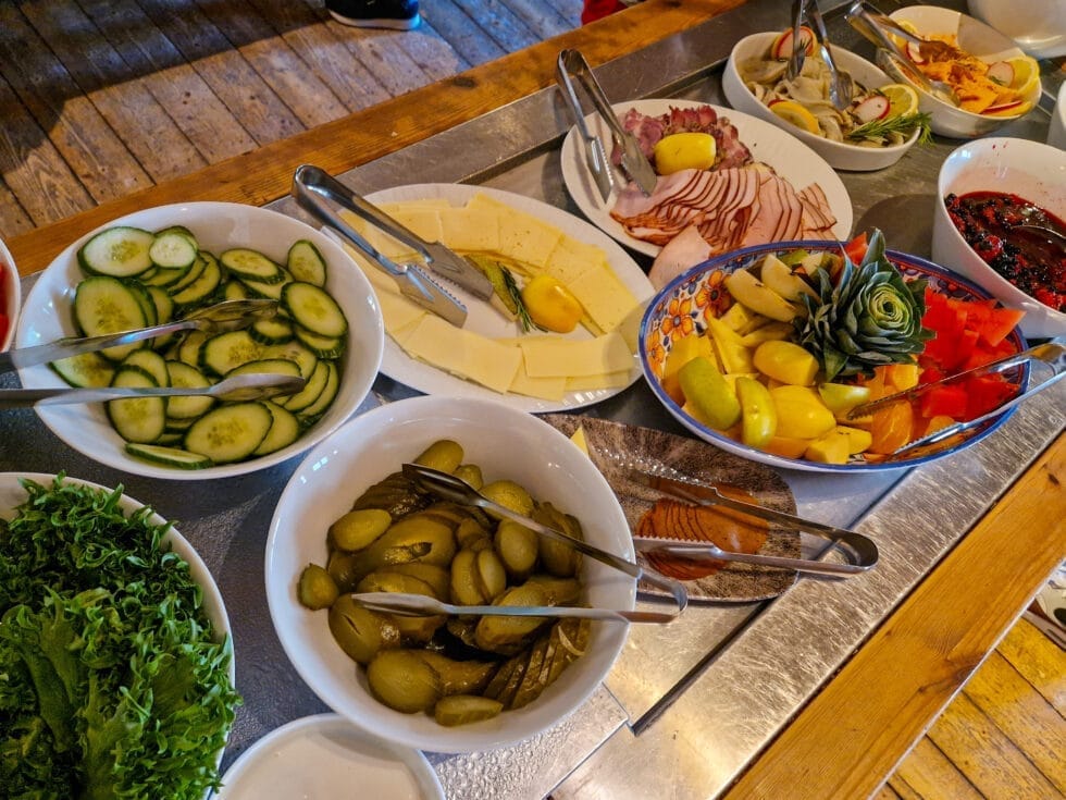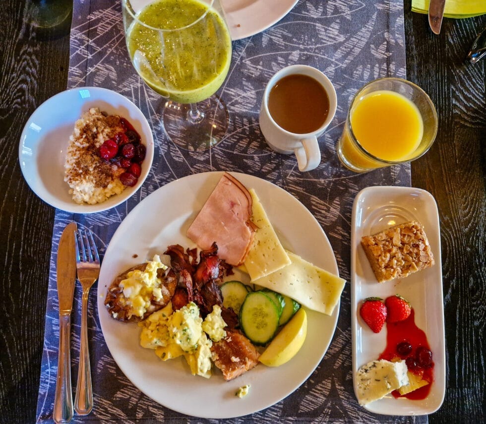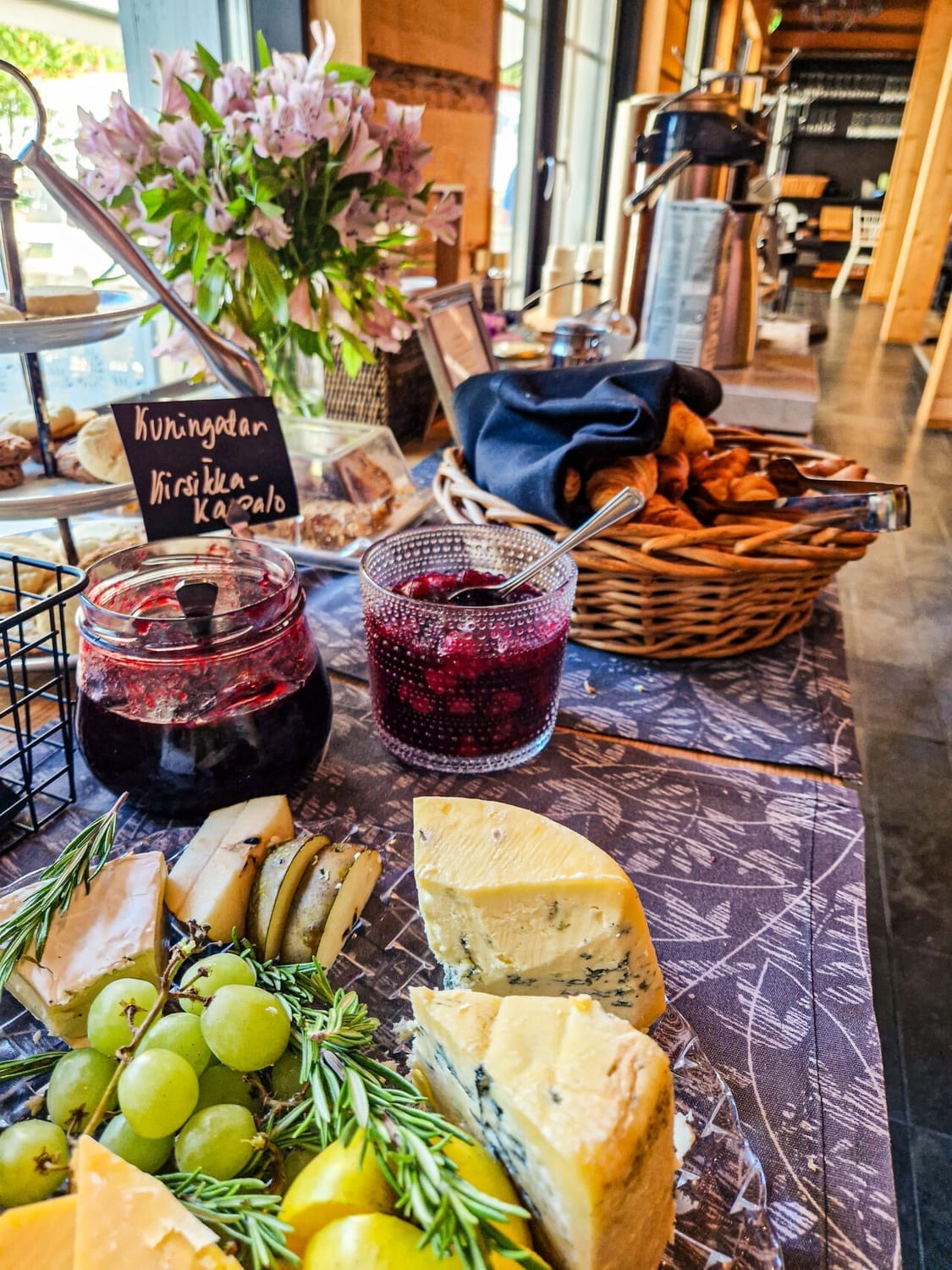 Pakko myöntää, että muutaman kerran heräsin yöllä ihmettelemään, että missä olen. Oli niin outoa ja ihanaa, kun sai kääntää kylkeä ja jatkaa unia, vaikka uni katkesikin hetkittäin. Monta vuotta putkeen joku on herättänyt vähintään kerran pari yössä, joten yksi yö ilman lapsia oli silkkaa luksusta! Aamulla suuntasimme Mankeliin aamiaiselle ja se oli kyllä kaiken kattava! Pöytiin oli katettu toinen toistaan herkullisempia ruokia ja iso osa oli lähellä tuotettuja tuotteita. Pöydästä löytyi mm. luomujugurttia, Krapin granolaa, muroja, paahdettua pähkinäsekoitusta, Suomalaisia marjoja, hedelmiä, juustoja, savustettua lihaleikkelettä, kauden suolattua kalaa, kasviksia, keitettyjä luomukanamunia, karjalanpiirakkaa, leipiä, uuniohrapuuro, munakokkelia, nakkeja, palvipekonia, smoothieta, mehuja, kahvia, teetä, voisarvia, Krapin hillokkeita, Suomalaisia pientilajuustoja, pikkuleipiä ja makeita kahvileipiä. Jokainen tarjolla oleva ruoka oli kertakaikkiaan todella hyvää! Pöydät eivät notkuneet miljoonaa eri sorttia, vaan tarjolla oli oikeasti laadukkaista raaka-aineista valmistettu aamiainen.