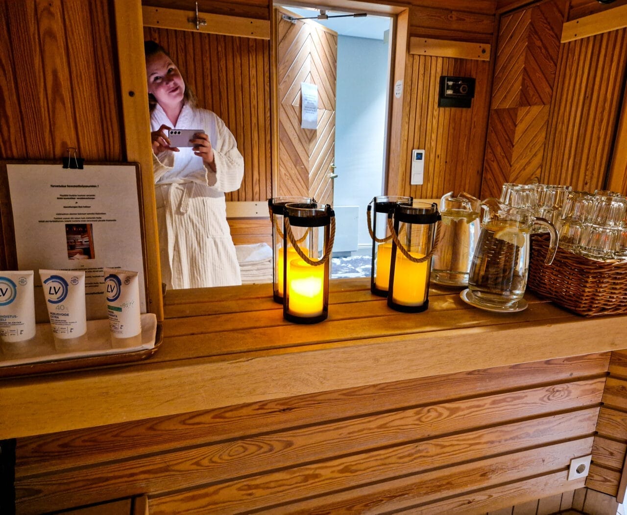 Yksi reissumme parhaista osuuksista oli luvassa seuraavaksi: AAMUSAUNA! Majoitukseen kuului saunavuoro ja me olimme varanneet sen aamuun. Krapilta löytyy myös savusauna, mutta tämä majoitukseen kuuluva saunavuoro oli hotellin alakerrassa olevassa sähkösaunassa. Oli ihanaa laittaa pehmeät kylpytakit päälle ja kävellä tossuissa käytävän toiselle puolelle tunnelmalliseen saunatilaan. Pukuhuoneessa meitä odotti kynttilät, kannullinen vettä ja ihania tuotteita, joilla sai tehdä esimerkiksi vartalokuorinnan. Aamusauna oli todellista luksusta ja se auttoi heräämään uuteen päivään. Saunan jälkeen otimme puolen tunnin päikkärit ja aloimme pikku hiljaa valmistautua huoneen luovutukseen. Oli haikeaa paikkailla kasseja juuri, kun olimme päässeet vauhtiin, mutta onneksi meillä oli vielä ihanaa ohjelmaa edessä päin! Seuraavaksi suuntasimme nimittäin Mankelin kesäisen lounaspöydän kautta Krapin puistossa sijaitsevaan kesäteatteriin!