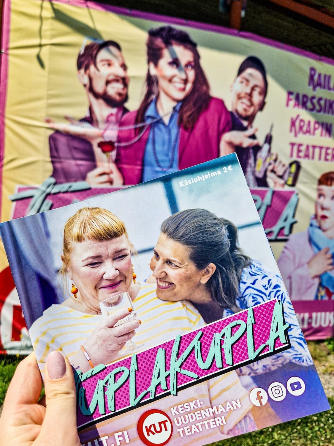 Kesäteatterissa Keski-Uudenmaan Teatteri esitti ihan mielettömän hauskan esityksen nimeltä “Tuplakupla”! Kyseessä oli varmasti yksi parhaita teatteriesityksiä, joita olen koskaan nähnyt! Esityksen punaisena lankana oli tuulettaa perinteistä parisuhdenormia ajatuksella “miksi tyytyä yhteen?”. Päähenkilönä toimi Hantta, joka ei uskonut perinteiseen avioliittoon, vaan eli kahden miehen kanssa. Ainoa ongelma oli, että nämä miehet eivät tienneet toistensa olemassa olosta ja myös heillä itsellään oli omat vaimot. Tilanne kärjistyi ja valkoiset valheet menivät niin mutkalle, että meinasi jo olla hankalaa pysyä perässä, että kenelle kerrottiin minkälainen satu ja kuka puhui totta. Kyseessä oli tosi hauska parisuhdekomedia, josta tuli todellinen farssi. Meitä kovasti nauratti, kun Hantan ystävä Anne oli muuttanut kuulemma kauas kaikesta, eikä hän siksi ollut nähnyt ystäväänsäkään ikuisuuteen. Hänen miehensä oli nimittäin raahannut hänet PERÄSEINÄJOELLE, jonka hän oli lyhentänyt sanaksi PERSE. Seinäjokiseen vitsi osui ja upposi. Tänne kannattaa kyllä suunnata katsomaan show omin silmin! Esityksiä näkyi olevan elokuun loppuun saakka. Vinkki! Kannattaa tilata etukäteen Krapin verkkokaupasta tarjoilut väliajalle, niin ne odottavat nimelläsi pöydässä eikä tarvitse jonotella. Voin suositella kahvia ja pullaa sekä tottakai kannattaa myös ottaa lasit kuplivaa! Jos menisin itse iltanäytökseen, niin varaisin väliajalle viinit ja Krapin tapaksia ja suuntaisin esityksen jälkeen illalliselle Mankeliin. Etukäteen varattavia tuotteita voi katsoa täältä!