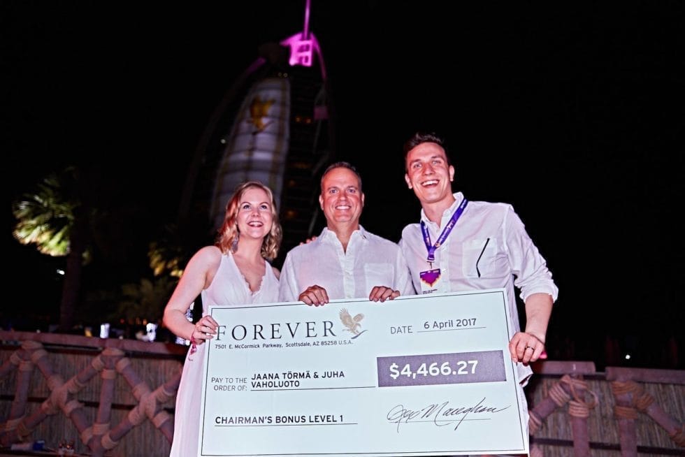 Tästä koulutuksesta alkaen teimme töitä noin 5-15 tuntia viikossa Foreverin eteen. Teimme asioita, joita meille opetettiin ja kehityimme pikkuhiljaa. Viiden kuukauden päästä olimme saavuttaneet ensimmäisen suuremman tavoitteen: Manageri- eli johtajuustason. Ensimmäinen tulo tuosta työstä oli reilu 2500€ kuukaudessa. Tajusimme, että tällä työllä voi elää. Silloin minusta tuli verkostomarkkinoija ja yrittäjä. Sillä polulla olen edelleen ja yhtäkään mutkaa tai mäkeä en pois vaihtaisi!