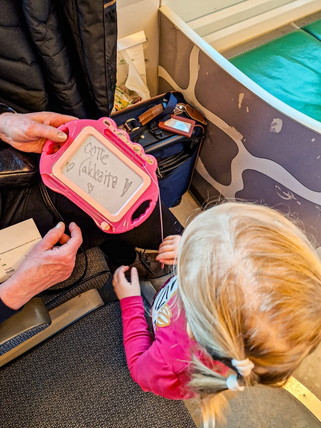 Tabletti, jossa ladattuna youtube premiumin kautta offline tilaan Pipsa possua ja muita lastenohjelmia. Lisäksi kannattaa ladata unilauluja tai kohinaa, jos niitä on tykännyt käyttää kotona nukuttamisen yhteydessä. Lisäksi meillä käytettiin piirtelyohjelmaa kovasti, sillä oikeat kynät hukkuivat helposti penkkien alle tippuessaan lattialle.