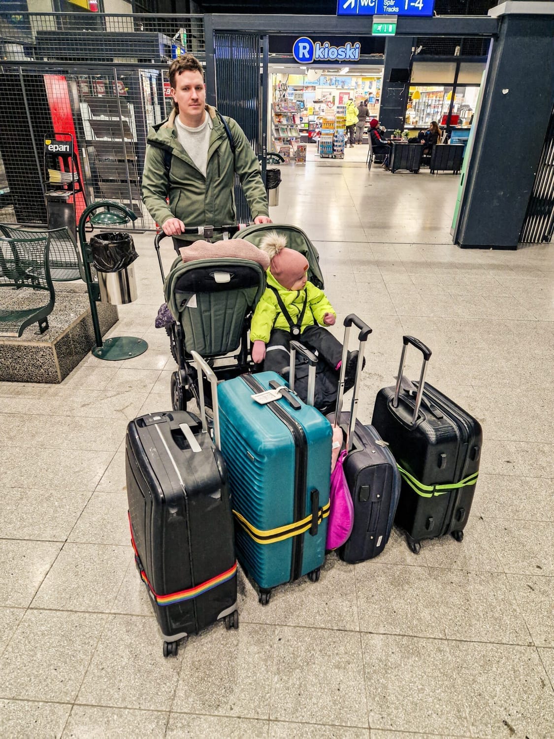 Miten paljon tarvitaan tavaraa, vaatetta, vaippoja ja ruokaa reissuun, kun matkustetaan lasten kanssa viikonlopuksi esimerkiksi mummulaan? Äkkiä sitä yksi autolastillinen on matkassa tavaraa! Entäs sitten, kun matkaan lähtee 2 pientä lasta ja 2 aikuista, luvassa on melkein kahden viikon reissu sekä kylmään että lämpimään kohteeseen? Tavaraa olisi voinut pakata vaikka kuinka paljon! Joskin piti pitää mielessä, että se kaikki on kannettava itse kotiin saakka takaisin sen lisäksi, että sylissä oli usein vähintään yksi lapsi. Toki meidän pakkaamista helpotti se tieto, että aikuisia on mukana reissussa monia, joten apukäsiä on saatavilla. Loppujen lopuksi tein pakkaustyötä varmaan kolme viikkoa. Halusin välttää viime hetken paniikkia ja varmistua samalla siitä, että saan nukuttua edellisenä yönä ennen lähtöä, jotta jaksan paremmin rankan matkustusrupeaman! Meillä oli mukana kolme ruumaan menevää laukkua, hoitokassi, viihdytys-/eväsreppu, käsimatkatavaralaukku ja käsilaukku. Tähän päälle oli tietysti ne tuplarattaat!