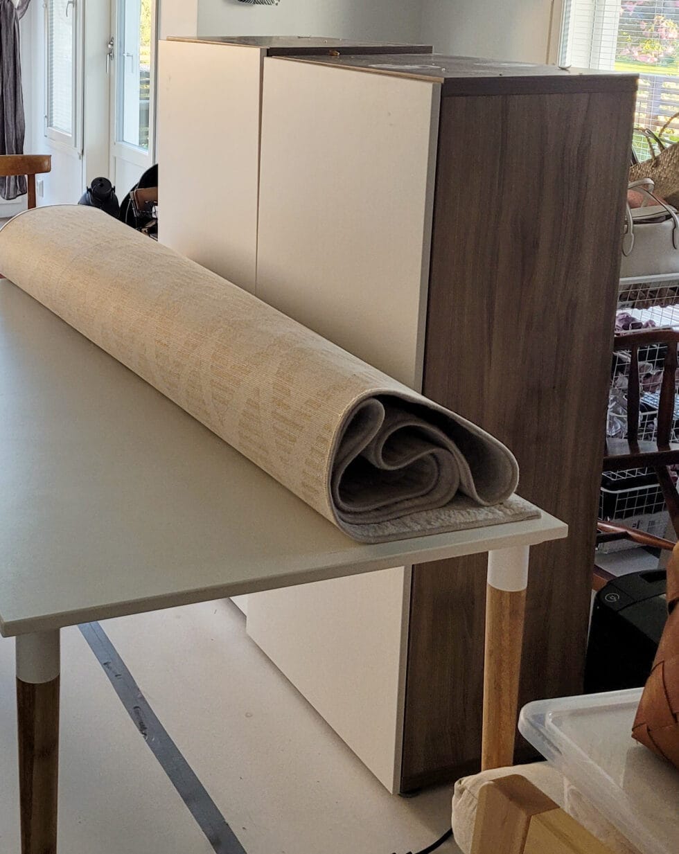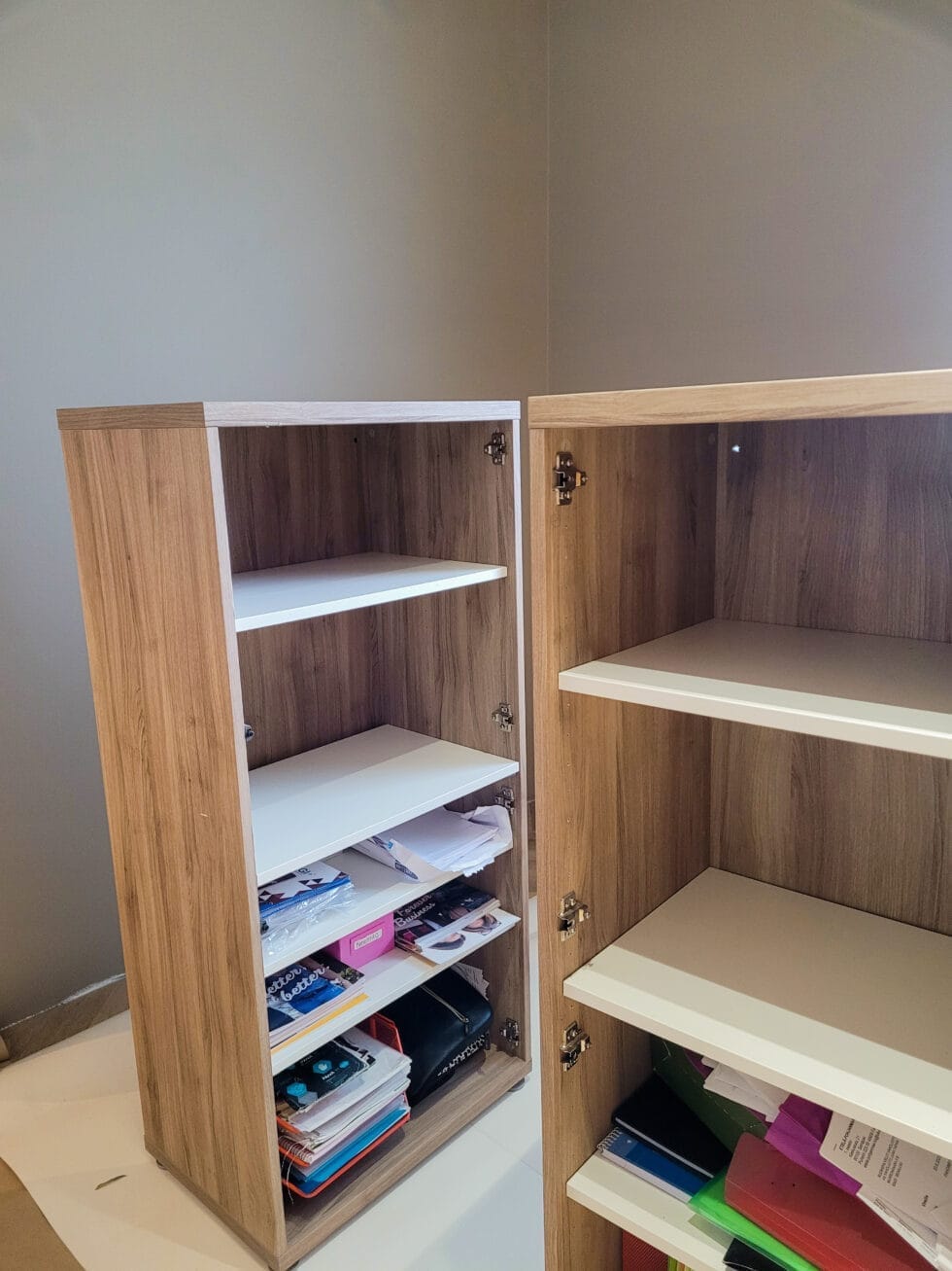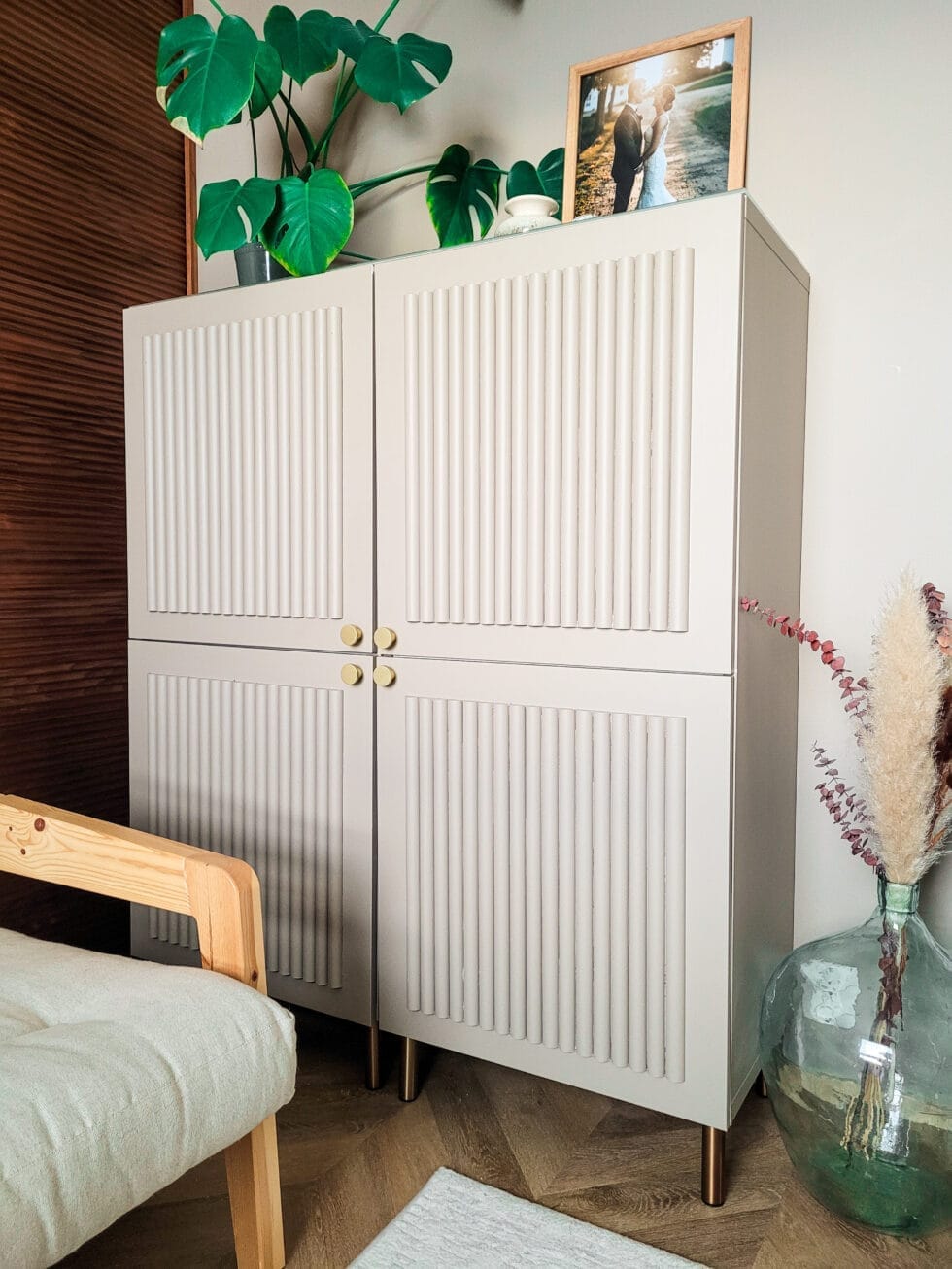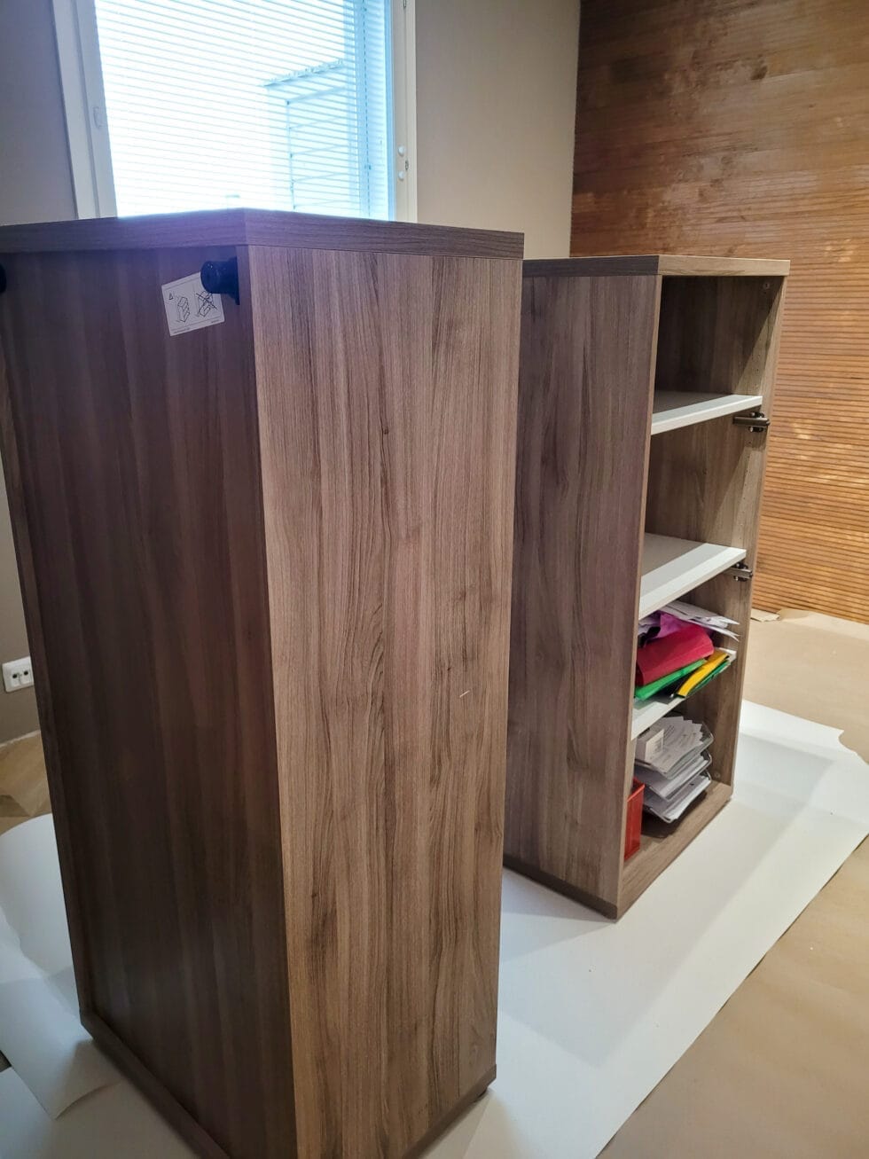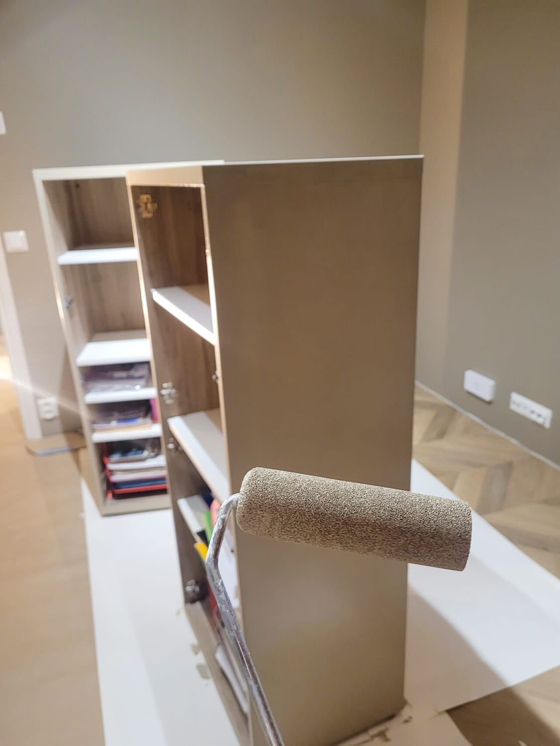 Maalasin seinät itse kahteen kertaan, jota edelsi tietysti se, että olin kitannut ja hionut seinissä olevat reiät siisteiksi. Kun maalaus oli valmis, niin rupesin katsomaan tarkemmin huoneen kalustukseen kuuluvia IKEA:n Bestå-kaappeja. Ne ovat todella kätevät säilytykseen ja tarpeelliset esimerkiksi työhöni liittyvien kosmetiikka- ja hyvinvointituotteiden säilyttämisessä. Ongelma vain oli, että puujäljitelmäkaappi ei sopinut enää ollenkaan huoneen uuteen tammen sävyiseen lattiaan, saatikka kauniiseen puupaneliseinään. Nopea googletus kertoi uusien kaappien hinnaksi useita satoja euroja, ja eihän se kovin ekologiseltakaan tuntunut uusia ihan toimivia ja siistejä kalusteita. Ei auttanut, kuin alkaa ideoida vaihtoehtoja.