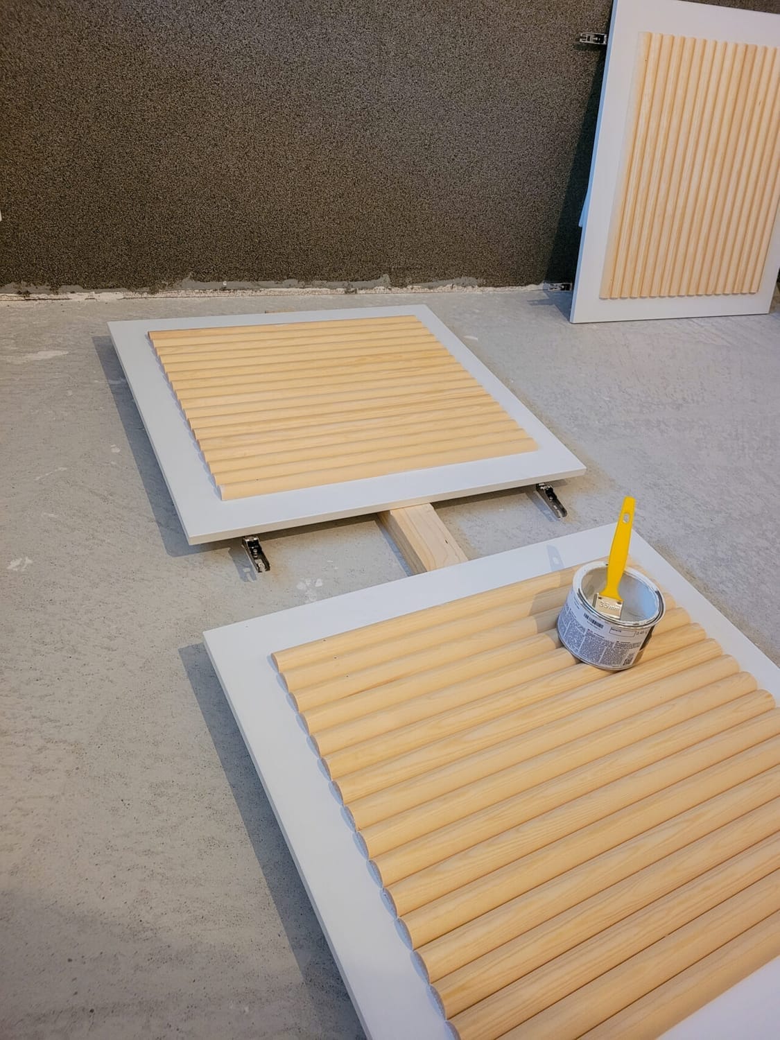 Isäni työsti ovet maalausta vaille valmiiksi ja minä maalasin ovien liukkaat pinnat samalla tartuntamaalilla kuin itse kaapitkin. CENT puolipyöreät listat toivat oviin upeasti näyttävyyttä ja särmikkyyttä! Listat päädyttiin liimaamaan, sillä naulat olisivat jääneet liikaa näkyviin. Maalasin ovet peräti kolmeen kertaan, jotta sain jäljestä tasaisen. Puisten listojen maalaaminen oli helppoa, mutta ovien reunoissa oleva tasainen pinta oli vaikea saada siveltimellä siistiksi. Tästä syystä maalasin reunat vielä viimeistelyn vuoksi pienellä telalla. Laadukkaasta listasta oli helppo työstää ovista siistit, kun listat olivat suoria ja tasalaatuisia!