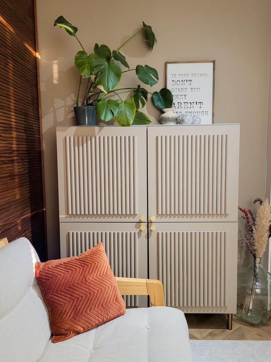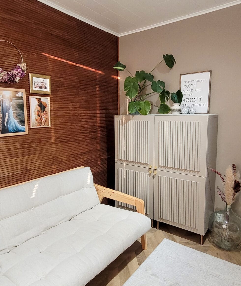 Idea kaapin tuunaukseen lähti siitä, kun päätin (päätimme) toteuttaa haaveeni upeasta CENT Lämpö dyynipaneelilla verhoillusta seinästä toimistoon/vierashuoneeseemme. Olin jo pitkän aikaa haaveillut, että kotitoimistoni saisi uudenlaisen sävymaailman ja siitä tulisi siten hieman kutsuvampi ja esteettisesti kauniimpi. Olin nähnyt tuota upeaa dyynipaneelia asuntomessuilla ja se oli jäänyt mieleeni! Huone sai uuden upean kalanruotolattian samalla, kun muidenkin tilojen lattiat päivitettiin. Vietin tunnin, jos toisenkin miettiessäni ja vertaillessani huoneeseen sopivaa uutta maalisävyä, sillä halusin päästä valkoisista seinistä eroon. Loppujen lopuksi päädyin Teknoksen värikartan sävyyn Fika.