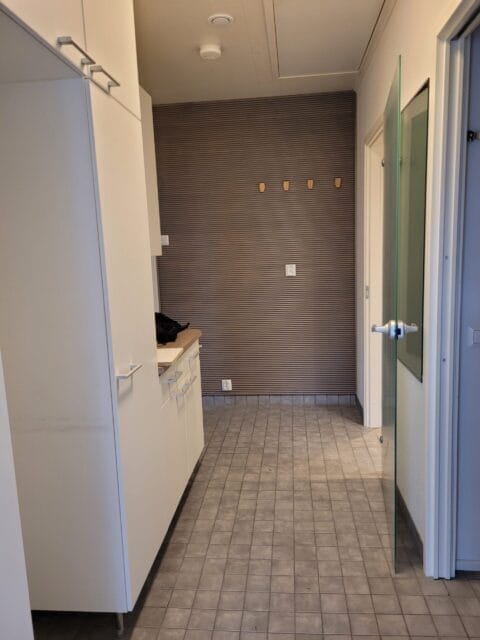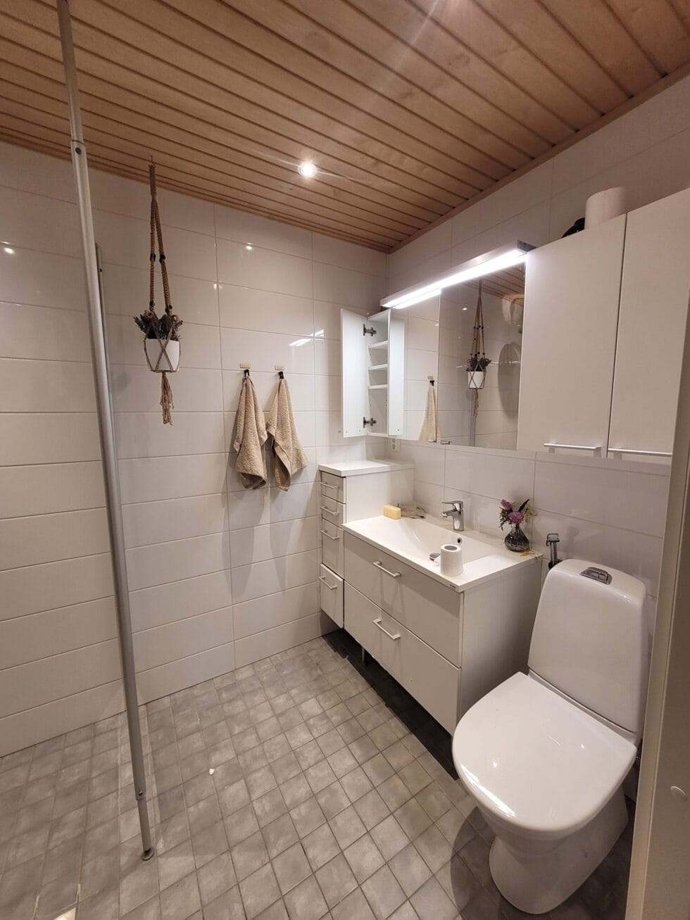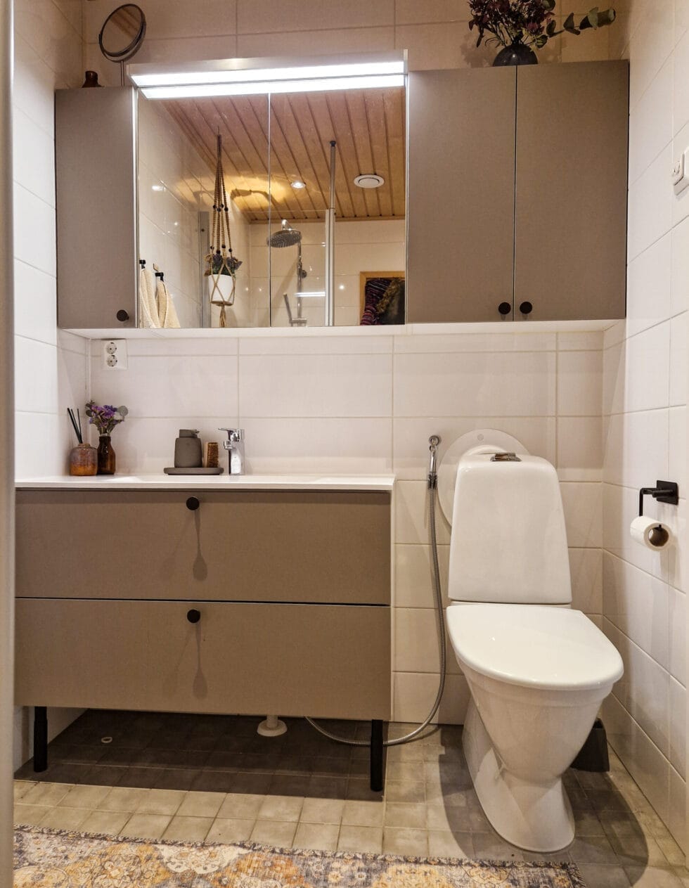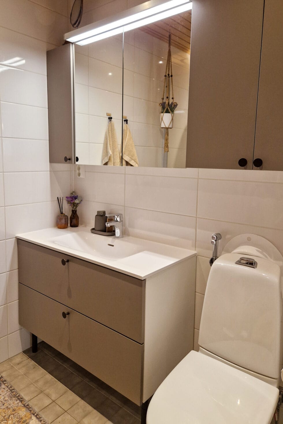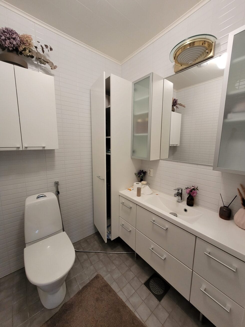 Kylpyhuoneeseen haluttiin saada pientä muutosta, koska alakaappi ei ollut kovin toimiva ja tasotilaa ei ollut juurikaan. Lisäksi kaapistoissa ei ollut pesuhuoneeseen sopivia ovia, niin ne olivat vaurioituneet vesiroiskeista. Pramia Kalusteiden kautta sai kätevästi tilattua omiin mittoihin sopivat ovet, joten vanhat yläkaappien rungot säilytettiin ja vain ovet vaihdettiin. Lisäksi kylppäriin uusittiin allaskaluste. Ovissa on sama väri käytössä kuin kodinhoitohuoneessa. Lisäksi kylppärin silikonit uusittiin. Lopulta melko pienellä vaivalla kylpyhuoneeseen saatiin raikas ja uusittu ulkoasu!
