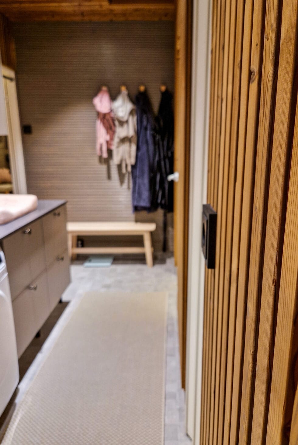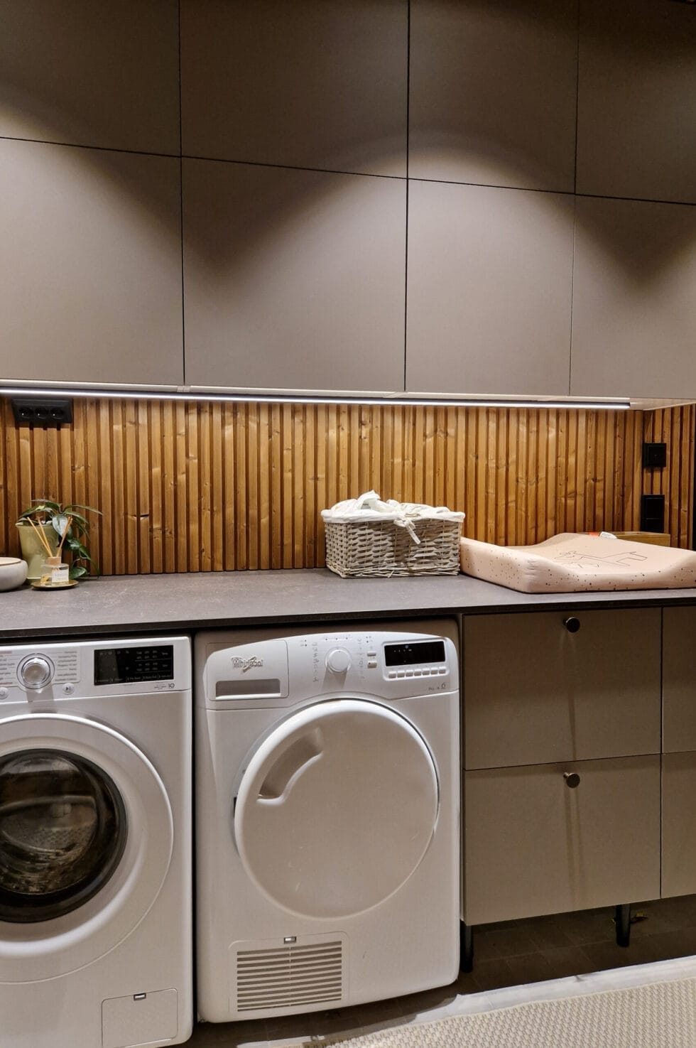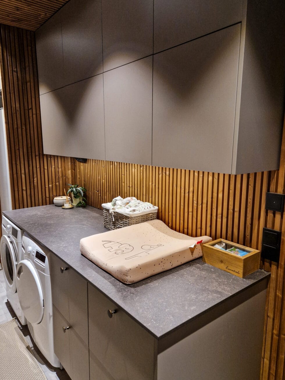 Kodinhoitohuoneen tunnelmaan vaikuttaa sekin, että karsea loisteputkivalaisin vaihdettiin kauniisiin ja siroihin spottivaloihin. Haaveilen vielä, että jäljelle jääneistä paneelin pätkistä tehtäisiin vaatehuoneeseen liukuovi vanhanaikaisen valkoisen haitarioven tilalle. Kodinhoitohuoneesta saatiin spa-tunnelmainen tekemällä väliseinä vesivaraajan eteen samasta paneelista, jolla seinät, katto ja kalusteiden välitilat päällystettiin. Asuntomessuilla olin ihastunut ruskean ja harmaan väliin sijoittuvaan moccan ja greigen sävyihin. Päädyimme suunnittelemaan Pramia Kalusteiden kanssa kodinhoitohuoneen kalustus kokonaan uudenlaiseksi vastaamaan uusia tarpeitamme. Tasotilaa oli edellisessä kodinhoitohuoneessa surkean vähän ja nyt sitä on niin, että piisaa! Yläkaapit sijoittettiin ulottumaan kattoon saakka, jotta saatiin kaivattua lisäsäilytystilaa ties mille tavaroille! Sieltä löytyy tällä hetkellä koko perheen pyyhkeet, lastentarvikkeita, tallivaatteet, pyykkäystarvikkeet, lamput, patterit, pientavaroita, Juhan urheilukamoja ja vaikka sun mitä muuta! Kaapinovet ovat sävyltään Pramian Luxe supermatta zenit mocca. Tykkään näistä kaapeista aivan superpaljon ja muutos entiseen on valtava!