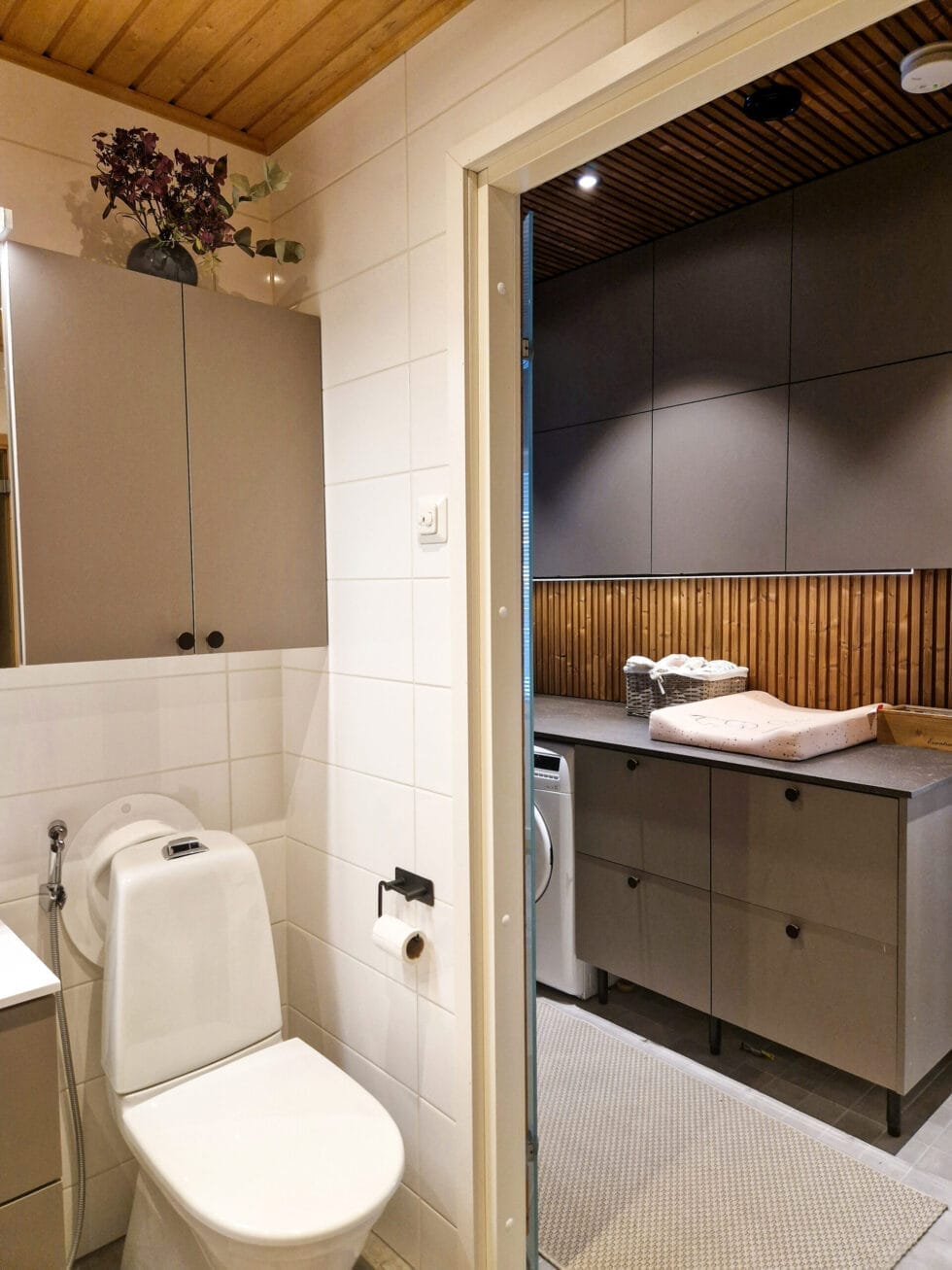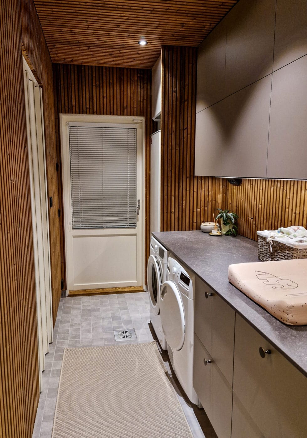 Kodinhoitohuoneemme oli tila, josta koko remontti alkoi, koska siellä vesivahinko oli tapahtunut. Olisin alunperin halunnut valita laattalattiaan isot laatat, mutta se ei ollut mahdollista keskellä lattiaa olevan lattiakaivon takia, joten päädyimme valitsemaan samantyyliset 10*10 laatat, jotka kylpyhuoneessa oli. Päädyimme tähän valintaan sen takia, että usein kodinhoitohuoneen ovi on auki ja näkyvyys on kylppäriin saakka. Nyt, kun laatat ovat samanlaiset, niin näkymä on seesteinen ja harmoninen. Toteutetaan sitten joskus haaveideni isolaattainen lattia, kun rakennamme uuden kodin alusta saakka. Muuta samaa kodinhoitohuoneessa ei sitten oikeastaan olekaan alkuperäisen kanssa. Kirjoittelinkin aikaisemmassa blogipostauksessani, että olin rakastunut rimapaneeliin ja päädyimme verhoilemaan kodinhoitohuoneen kokonaan upealla CENT:n rima-3 paneelilla. Olen ihan älyttömän tyytyväinen lopputulokseen! Rimapaneeli luo kodinhoitohuoneeseen tunnelmaa ja lämpöä, olematta kuitenkaan synkkä. Vai mitä olet mieltä?