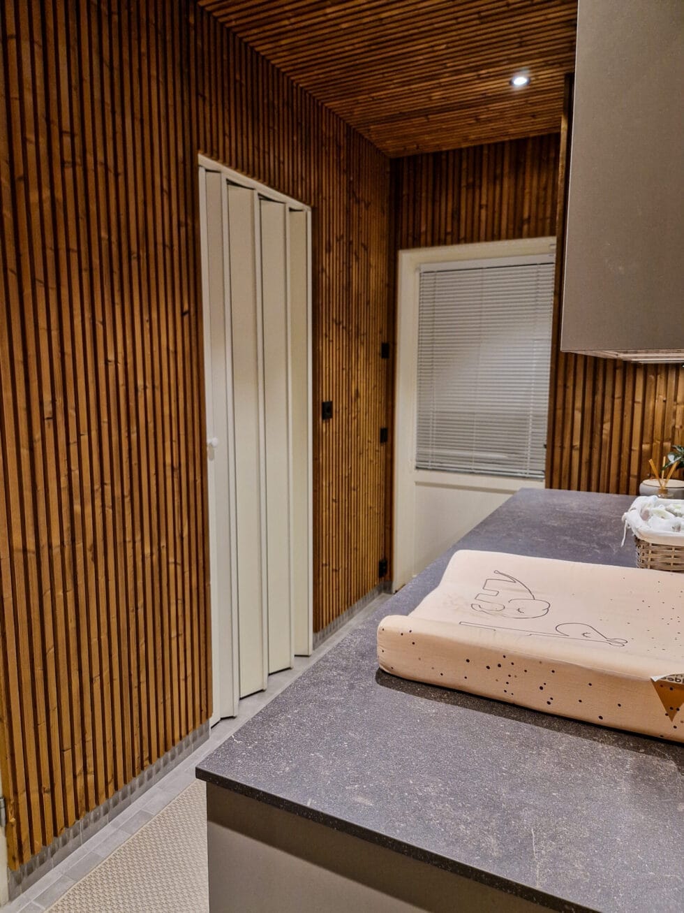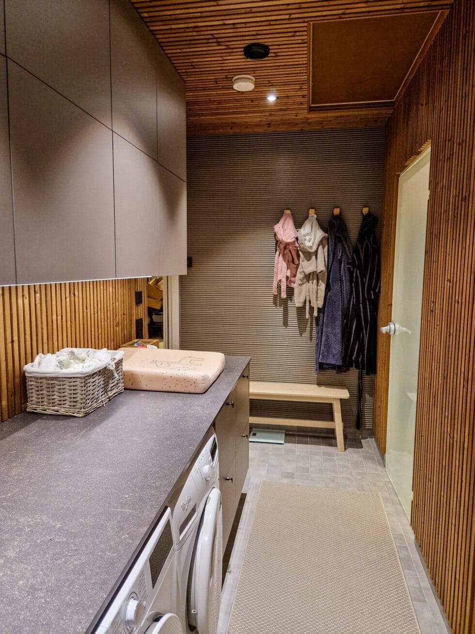 Vintille menevä luukku päädyttiin maalaamaan ruskealla ja isäni teki reunoille CENT:n lämpö dyyni-paneelista listat, jotka sopivat katon rimapaneeliin täydellisesti. Lämpö dyyni-paneelia jäi juuri sopivasti sen verran yli toimiston seinän verhoilusta, että se riitti listoihin. Kodinhoitohuoneen tason syvyys on noin 80cm ja se on toimiva ratkaisu esimerkiksi pyykin viikkaamiseen ja vaipan vaihtamiseen. Käytävälle jäi kuitenkin ihan kivasti tilaa, jotta siinä pystyy toimimaan.