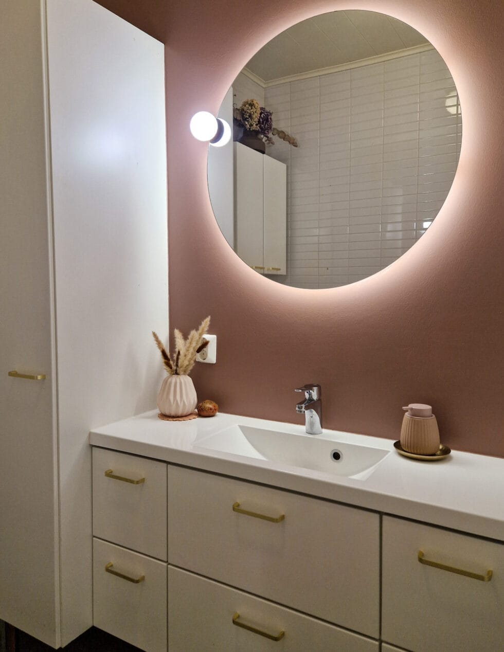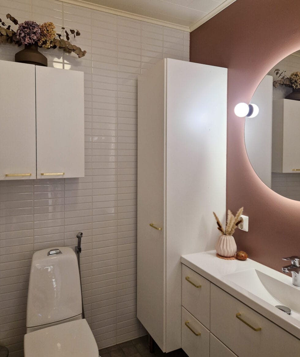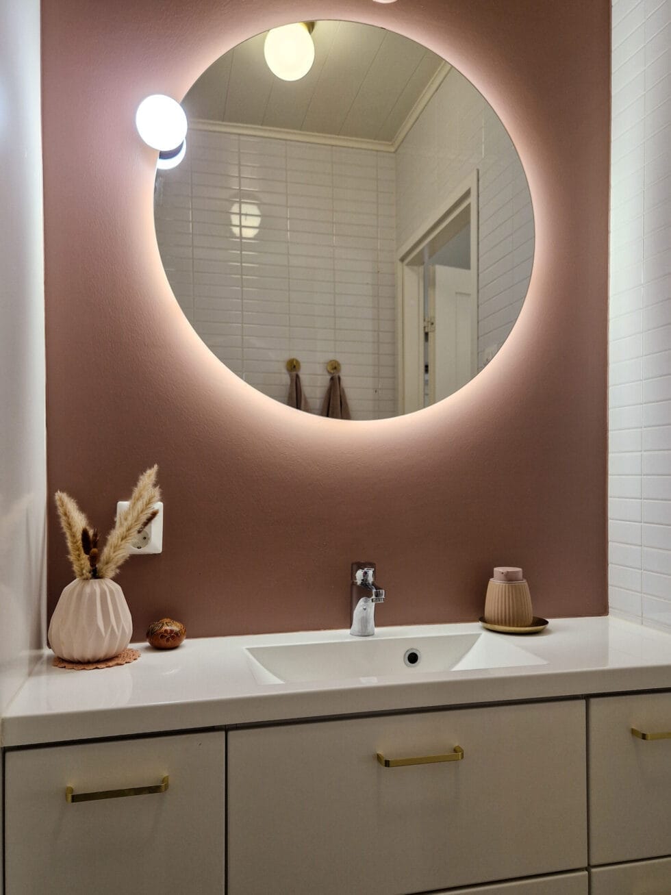 Olisin halunnut uusia pieneen WC:hen kaapistot, mutta jostain piti tällä kertaa tinkiä ja vanhat kaapit saivat jäädä. WC näyttää silti aivan uudelta ja heräsi eloon pienellä vaivalla! Vanhanaikaiset yläkaapit ja peili sekä hirvittävän ruma valo otettiin pois ja seinä tasoitettiin rakennuslaastilla. Tasoittamisen jälkeen seinä sai kauniin uuden violettiin menevän värin ja aivan mielettömän upean Seinäjokisen Muatoa-peilin meikkivalon kera! Kerroinkin Muatoa-peileistä edellisessä postauksessani ja sen voi lukaista tästä. Peilejä on monia erilaisia ja niihin on valittavana lisävarusteita, kuten meikkivalo, höyrynpoisto, himmennys tai pistorasia. Peili on unelmieni täyttymys ja näyttää upealta tuoden tilaan epäsuoraa valoa! Olen maailman huonoin tekemään päätöksiä, mutta jotenkin tämä Halo-niminen peili puhutteli heti sen nähtyäni! Meidän peili on 80cm halkaisijaltaan ja siihen tilattiin lisävarusteena pallomainen meikkivalo. Meikkivalon paikan voi itse määrittää ja niitä voi olla useampiakin! Tarvittaessa se on myös helppo ottaa pois. Lisäksi uusimme vanhojen kaappien vetimet ja jalat Helatukun mallistosta. Näitä vetimiä ja jalkoja voi ostaa kuluttajana suoraan esimerkiksi netraudasta. Messingin sävyiset Beta-mini vetimet tekivät vanhoista kaapeista kuin uudet! Samaten messingin sävyssä olevat Rev-kalustejalat viimeistelivät lopputuloksen. Tulevaisuudessa haluaisin hankkia Muatoa-peilien suorakulmaisen mallin kodinhoitohuoneeseen. Se olisi kaunis ja keveä katseenvangitsija upealle rimaseinälle!