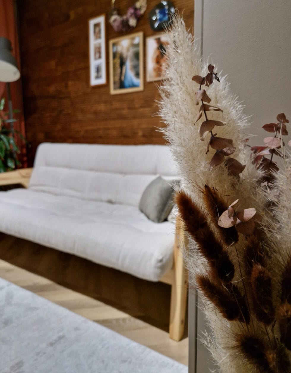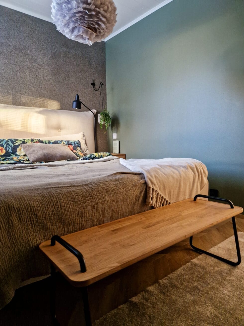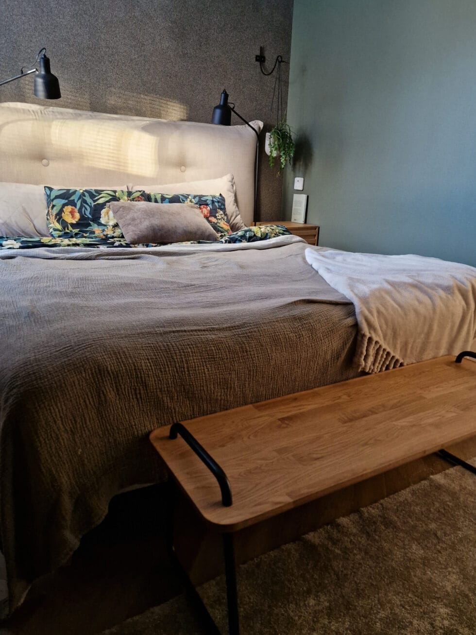 Siitä se ajatus sitten lähti ja mopo karkasi käsistä! Näin sivuilla aivan mielettömän upeat tammiset Eicon-yöpöydät, jotka sopivat ottomaani-penkkiin täydellisesti. Lisäksi uudet kalusteet sopivat kalanruotolattiaan, joten olihan muutos lähdettävä toteuttamaan! Kaipasimme enemmän tilaa yöpöydille, joten laitoimme tilaukseen Jensenin sänkyyn kiinnitettävät add on-yövalot, jolloin yöpöydät jäävät vapaaksi. Olemme pitkään mieheni kanssa puhuneet, että pitäisi vähentää puhelimen selaamista iltaisin ja ottaa esimerkiksi kirja käteen. Nyt sänky oikein kutsuu rentoutumaan, kun voi nojata ihanan pehmeään sängynpäätyyn ja napsauttaa oikeasti hyvän yövalon päälle ja alkaa lukemaan. Olemme puhuneet, että vuoden 2024 tavoitteemme olisi lisätä omaa hyvinvointiamme laskemalla kierroksia ja oppimalla rauhoittumaan. Ihana makuuhuoneemme varmasti auttaa tässä tavoitteessa!