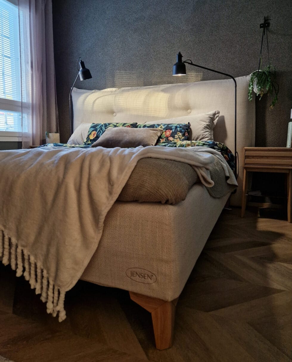Heti alkuun on pakko sanoa, että RAKASTAN meidän uusittua makuuhuonetta ja varsinkin ihanan isoa ja löhöilyyn houkuttelevaa uutta Jensenin Cozy-sängynpäätyä! Se on täydellinen ja luo makkariin juuri sellaista arjen ylellistä tunnelmaa, jota toivoinkin! Makuuhuoneen kalustus meni sänkyä lukuun ottamatta uusiksi, kun innostuin kurkkaamaan Jensenin nettisivuille. Meillä on ollut jo muutaman vuoden käytössä Jensenin Nordic Seamless-sänky, josta tykkäämme kovasti! Sängyssämme on exact-toiminto, jonka avulla voimme säätää molemmille henkilökohtaisiin tarpeisiin sopivan tuen alaselälle ja lantiolle. Sängyn hankinnan jälkeen ei enää aamuisin tunnu siltä, että olisi rekan alle jäänyt. Vanhassa sängyssämme särki ja kolotti joka paikkaa, jos nukkui yhtään pidemmät yöunet, eikä aamulla olo ollut levännyt. Jos kuulostaa yhtään tutulta, niin voin hyvin lämpimästi suositella uuden sängyn hankintaa! Vertailimme hyviä sänkyjä silloin pitkään ja Jensenin sänky täytti kaikki toiveemme niin ostohetkellä, kuin nytkin muutaman vuoden kokemuksen perusteella.