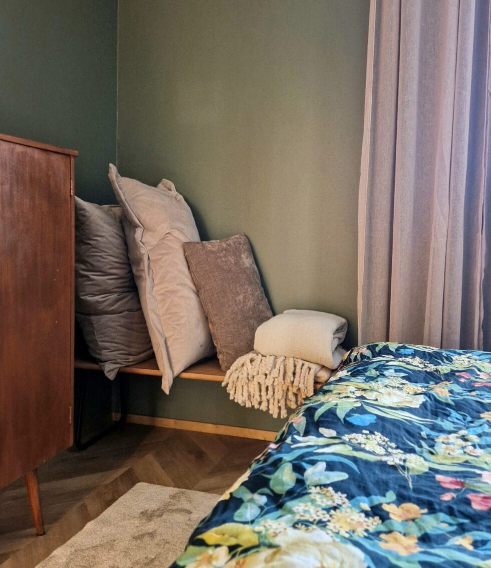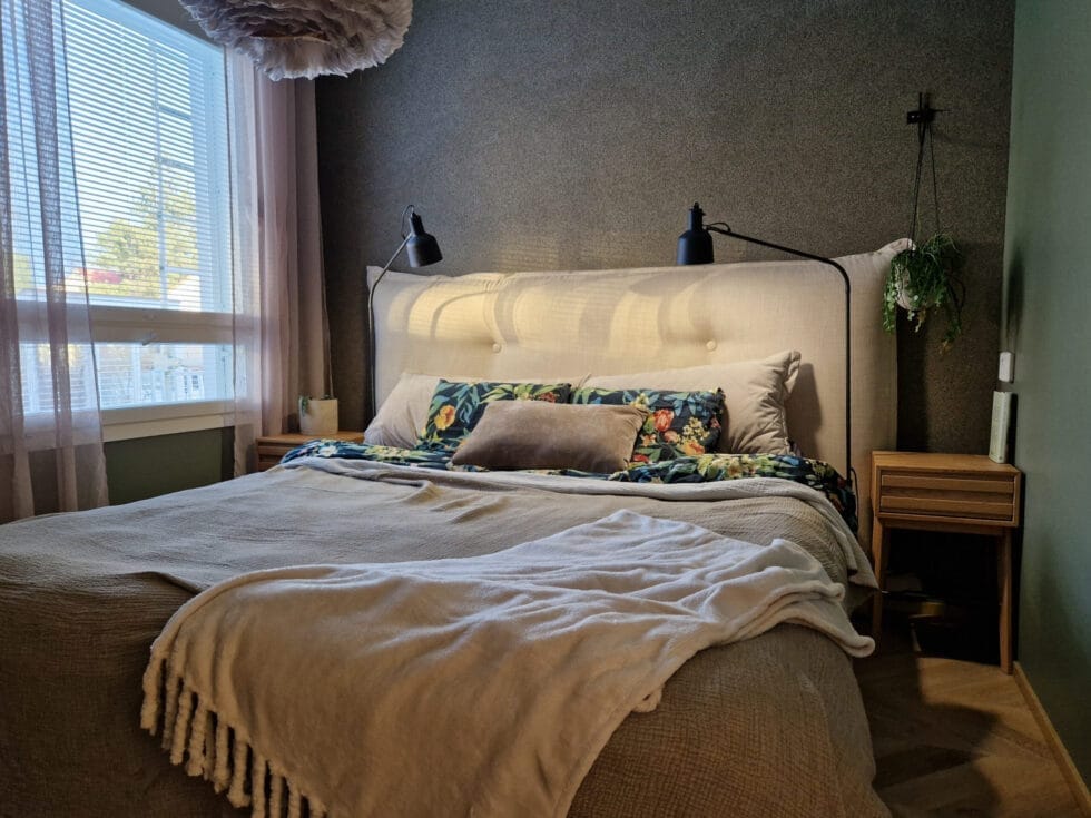 Lopputuloksen viimeistelee sänkyyn vaihdetut uudet tammiset Eicon oak-jalat sekä uusi beigen sävyinen kangas sänkyyn. Vaalean beiget sävyt tulevat kauniisti esiin tumman vihreäksi maalatusta makuuhuoneesta, joka on tumman sävyisenä rauhoittava ja kutsuu rentoutumaan ja rauhoittumaan. Olen niin tyytyväinen sängyn uuteen ulkoasuun! Miten helposti saikaan vanhasta sängystä kuin uuden uusimalla sen runkoon eri värisen kankaan! Kankaan vaihto itsessään oli hyvin nopea ja yksinkertainen juttu toteuttaa ja lopputulos on ihana! Herää vain kysymys, että koska seuraava inspiraatio sisustuksen muokkaamiseen tulee, koska Jensenillä oli vaikka mitä ihania kangasvaihtoehtoja! Vaihdoin ikkunaan lattiasta kattoon olevat verhot, jotka itsessään tuovat hieman hotellimaista tunnelmaa. Jahka pörssi sallii, niin uusin makuuhuoneeseen upeat uudet verhot koko seinälle. Jensenin tuotteita voi ostaa Vepsäläiseltä, Iskusta ja Stemmasta. Kävin ihastelemassa kankaiden sävyjä ja fiilistelemässä sängynpäätyä paikallisessa Vepsäläisen myymälässä. Voin luvata, että livenä tuotteet näyttävät vielä paremmilta kuin netin kuvissa! Jos uuden sängyn hankinta on ajankohtaista, niin suosittelen lämpimästi lukaisemaan tämän aikaisemman postaukseni, jossa kerron vinkkejä sängyn hankintaan. Yksi vinkki pitää kuitenkin heti sanoa: pötkötelkää rauhassa sängyissä, niin saa oikean tuntuman patjan kovuudesta! Olisimme valinneet liian kovan patjan ensituntumalta, mutta myyjä onneksi kehotti meitä fiilistelemään rauhassa sänkyä!