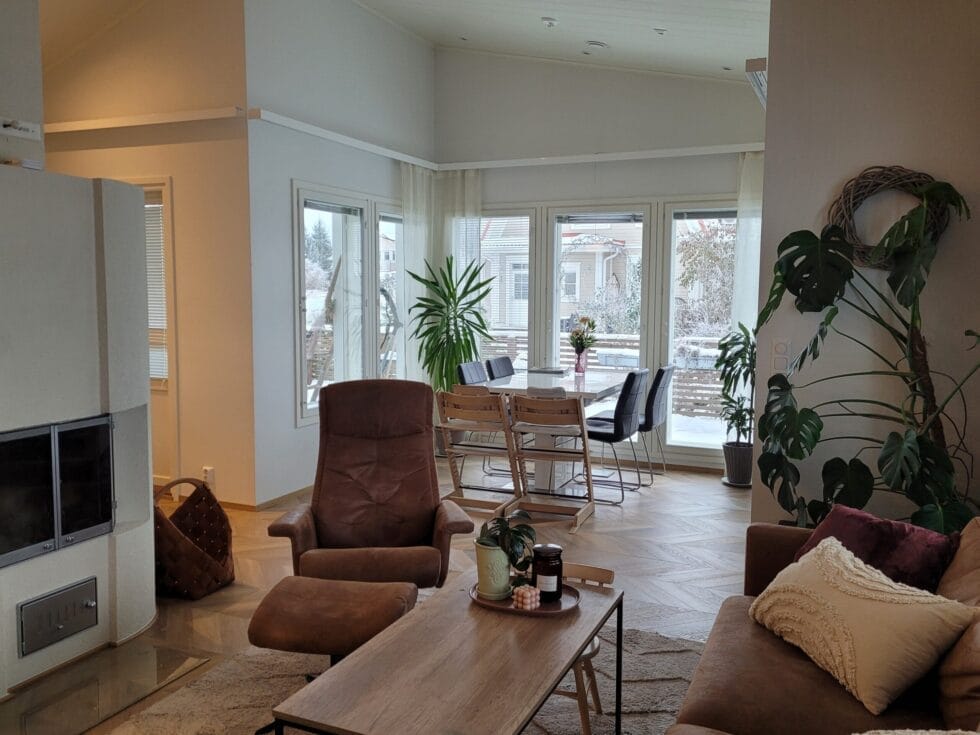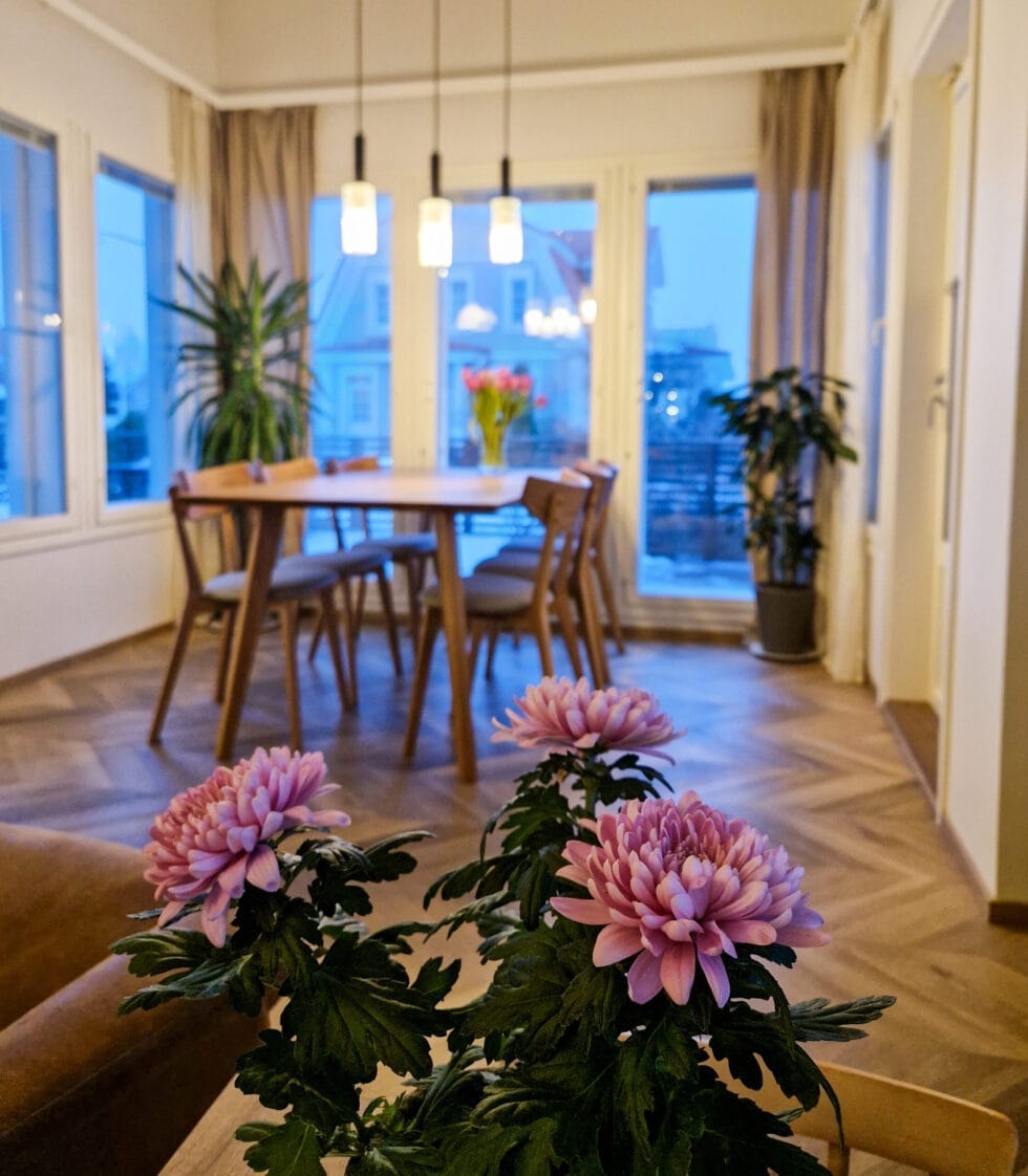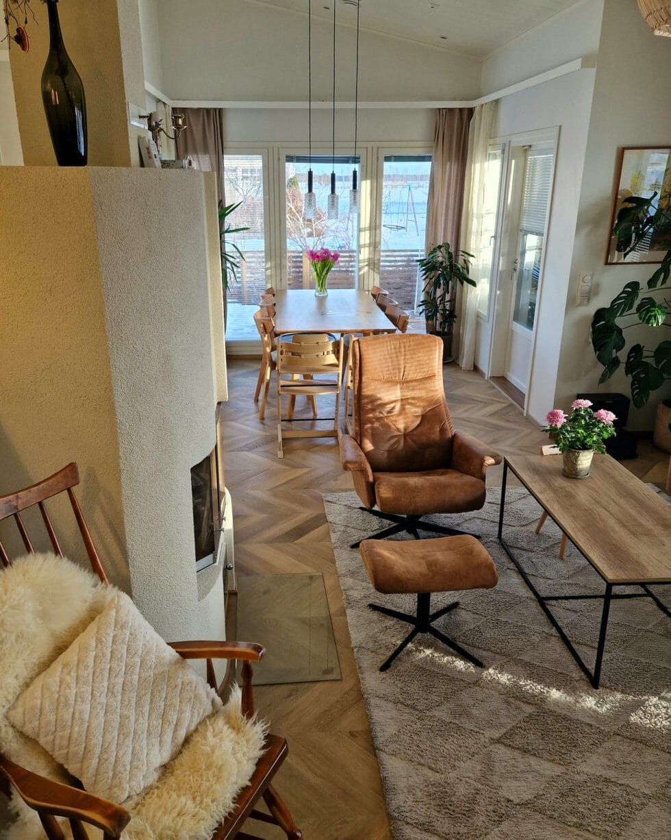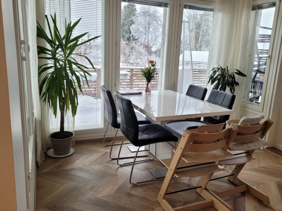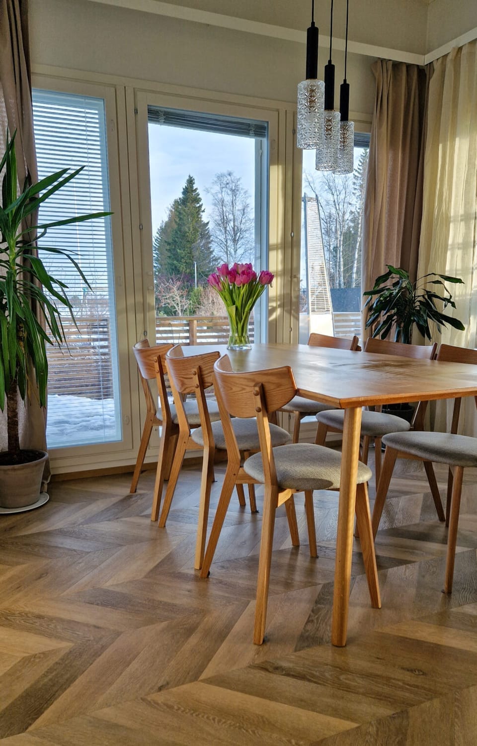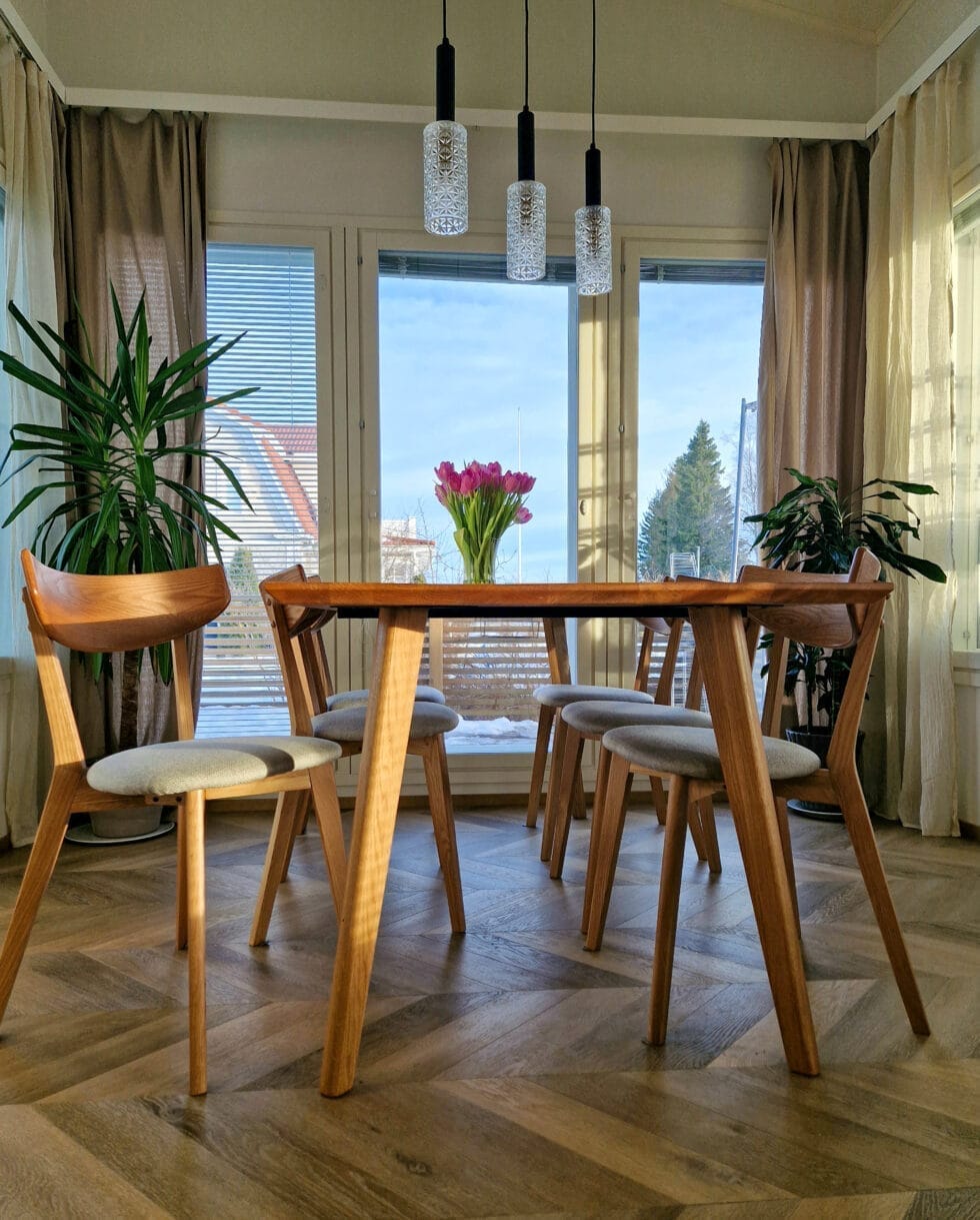 Olohuoneessa ei periaatteessa tehty mitään muuta remonttia kuin uusittiin lattia, listat ja maalattiin takka, mutta siitä huolimatta se näyttää ihan uudelta! Syy tähän on aivan mielettömän hieno, kotimaista käsityötä oleva tamminen Anttiinan ruokaryhmä! En voisi olla tyytyväisempi tähän valintaan, sillä ruokaryhmä on niin kaunis ja se muutti koko olohuoneen ulkoasun. Vanha pöytämme oli valkoinen korkeakiiltoinen pöytä mustien tekonahkatuolien kera ja ne olivat todella aikansa eläneet, eivätkä sopineet enää sisustukseemme. Uusi Directo-ruokapöytämme on ihanan siro, mutta samaan aikaan tilava, johon koko perheemme mahtuu syömään! Jouluna illallistimme meillä isovanhempien ja sisarustemme kera, jolloin uusi ruokaryhmämme keräsi ympärilleen iloista puheensorinaa herkkulautasten äärelle! Samalla uudet upeat Helsinki-tuolit pääsivät todelliseen koeajoon istuinmukavuudeltaan, kun pöydän ääressä istuttiin tunti toisensa perään. Jokainen vieraistammekin tuumasi, että tuolit ovat todella hyviä istua sen lisäksi, että ne ovat kauniita kuin karkit!