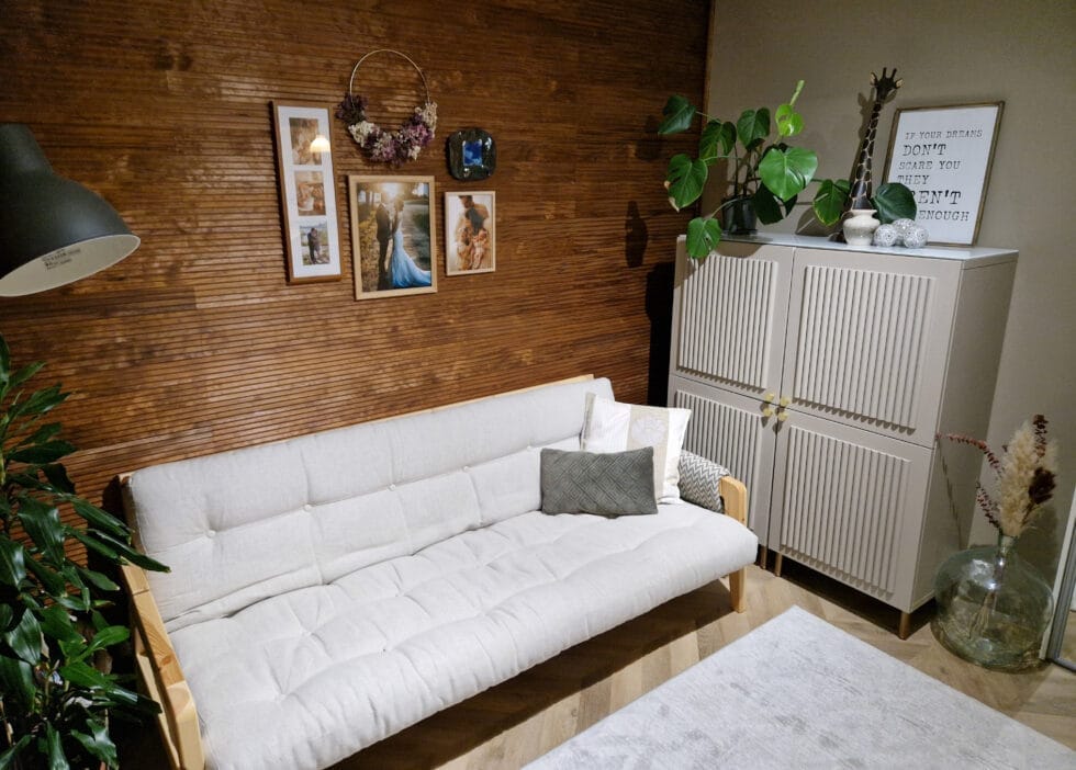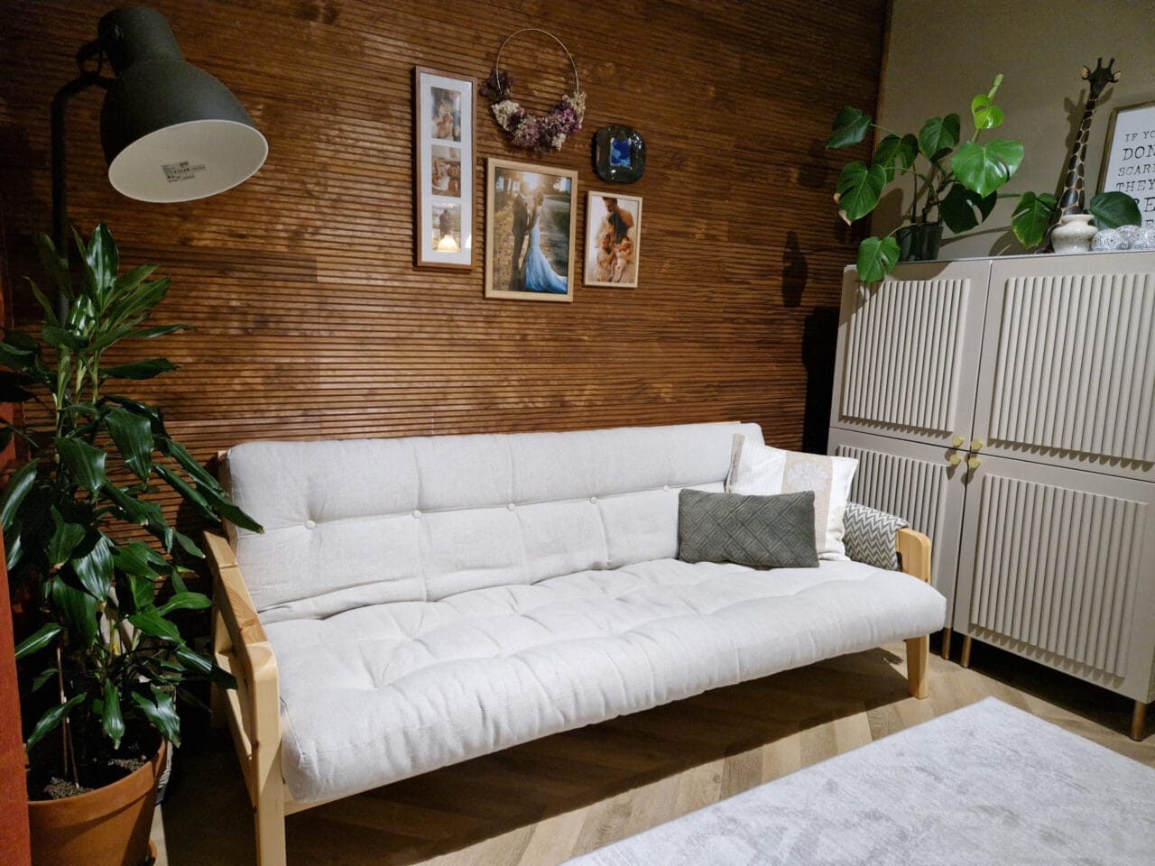 Toimistoa on vaikea uskoa enää samaksi huoneeksi, sillä sen värimaailma ja pinnat on uusittu täysin. Olin pitkään haaveillut, että kodissamme ei olisi niin valkoista ja halusin tuoda kotiin enemmän lämpimiä sävyjä. CENT Oy:n Lämpö Dyyni-paneelit olivat tähän oiva ratkaisu! Paneelien muotoilu on erilainen verrattuna kodinhoitohuoneeseen, mutta värimaailma on sama, joten sisustus kulkee harmonisesti samassa linjassa kuljettaessa eri tilojen välillä. Mielestäni tämä on tärkeää varsinkin, kun kotimme on melko pieni ja tilat ovat lähekkäin. Lämpö Dyyni-paneelit ovat lämpökäsiteltyä puuta, jonka takia seinä on kauniin ruskean sävyinen. Tuntuu kuin olisin saanut palan luontoa omaan työhuoneeseeni. Valkoiset seinät ovat muisto vain, sillä maalasin kaikki muut seinät kauttaaltaan Teknoksen värikartan Fika-sävyllä. Tarkemmin selitin työvaiheista aiemmassa postauksessani, jonka voi lukaista tästä! Ja hei, en malta olla vielä mainitsematta, että Ikean vanhasta Bestå-kaapista tuli kuin uusi, kun tuunasimme sen isäni kanssa uuteen uskoon CENT:n puolipyöreillä listoilla sekä Helatukun vetimillä ja jaloilla. Sen työvaiheet voit lukaista toisesta blogistani tästä!
