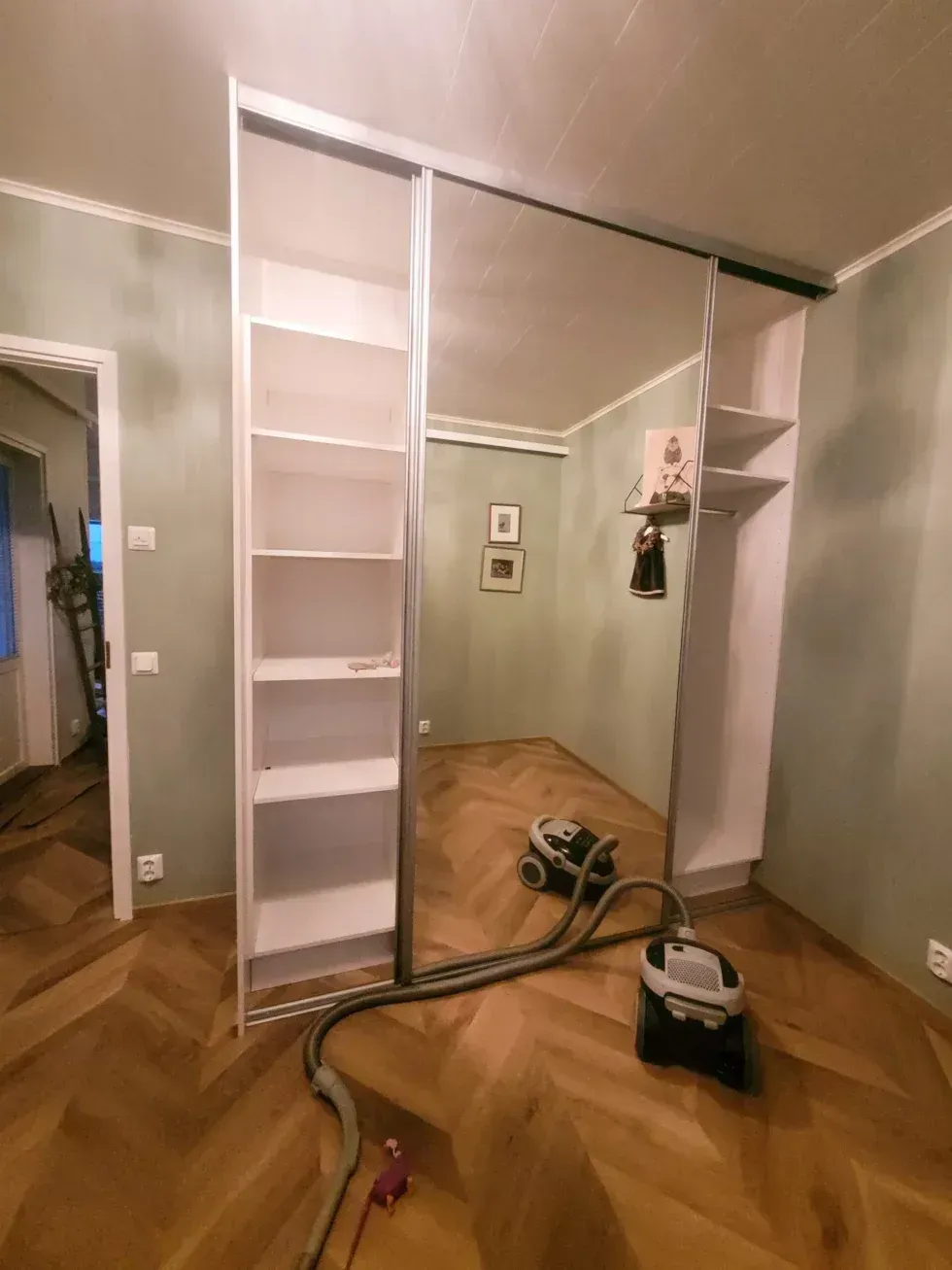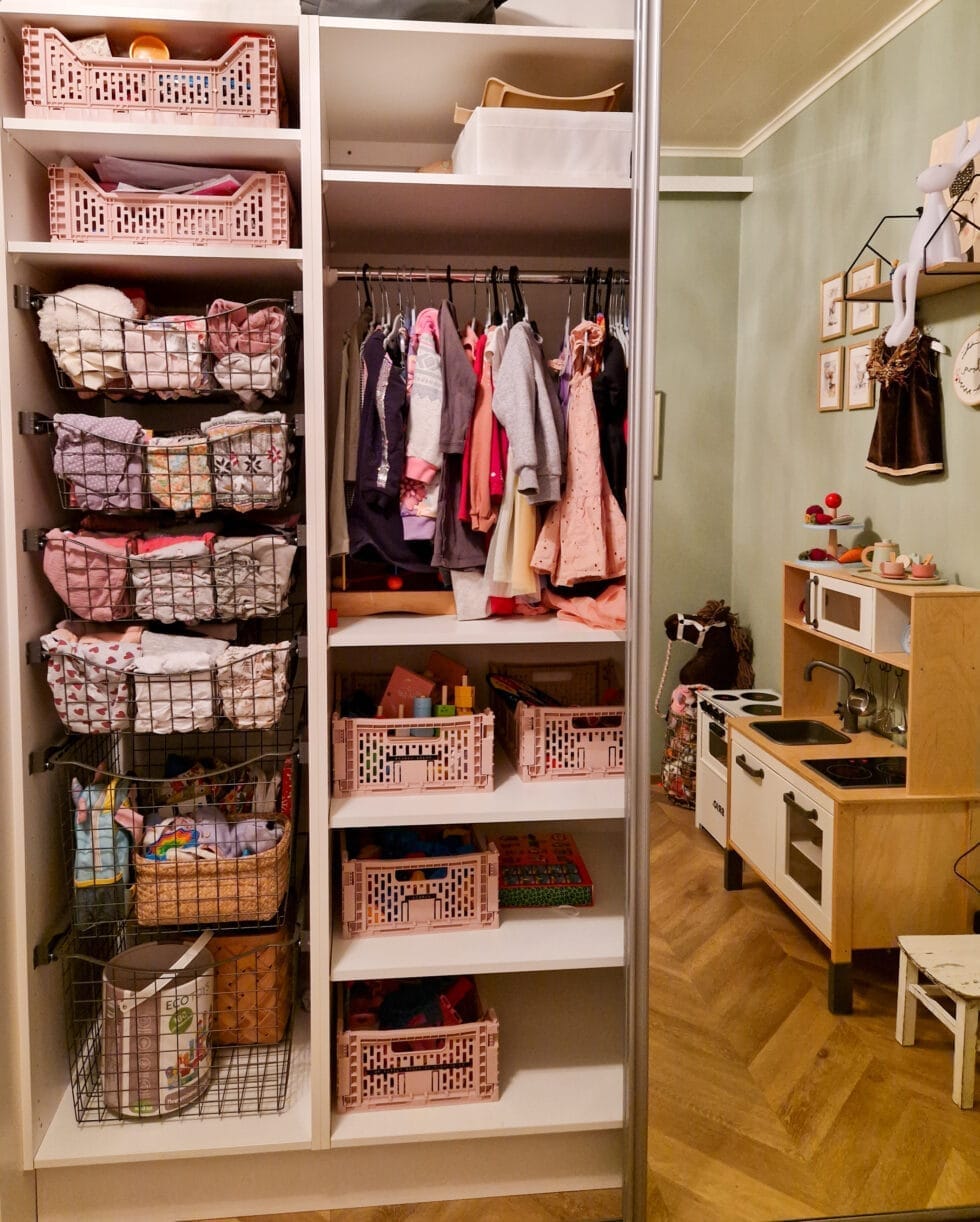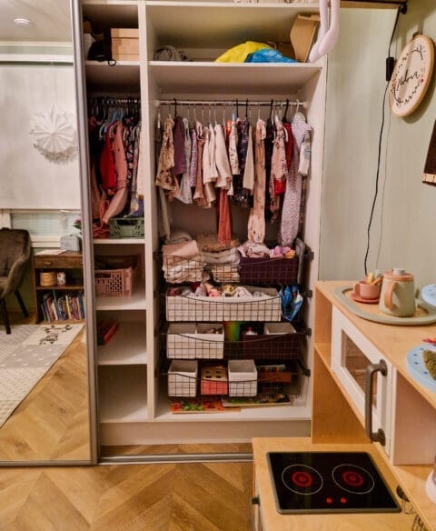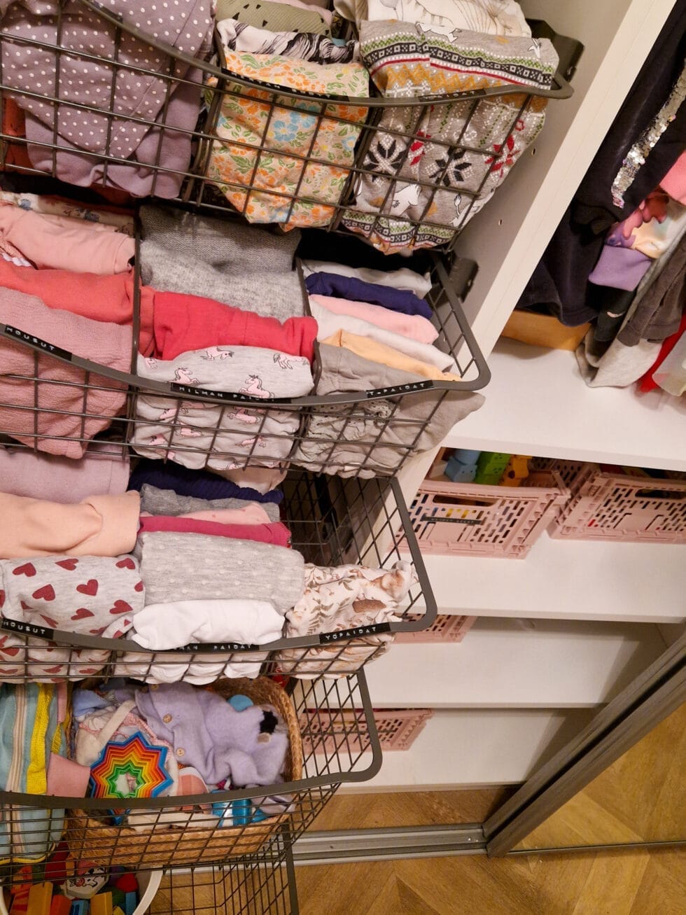 Ai että, olen niin odottanut, että pääsen näyttämään lastenhuoneen pienen, mutta todella jokapäiväistä elämäämme helpottaneen muutoksen! Uskon, että joku muukin voi samaistua ongelmaan, jossa säilytystilan määrä ei vastaa tavaroiden määrää, vaikka kuinka karsisi. Meidän koti on selkeästi suunniteltu enemmän aikuisten tarpeisiin ja varsinkin säilytystilaa kaipaisin hieman lisää. Lastenhuoneessa on iso lattiasta kattoon oleva peilikaappi, mutta sen sisällä oli kaksi tankoa ja yksi hyllykaappi isojen hyllyjen kera. Tilasimme muutama vuosi sitten keskikaappiin hyllylevyjä, mutta silti isot hyllyt olivat epäkäytännöllisiä pienten vaatteiden ja lelujen säilyttämisessä. Tähän asti päädyimme säilyttämään lastenvaatteita erillisessä lipastossa, mutta se ei ollut pitkäaikainen ratkaisu, sillä se vei huoneesta leijonaosan tilaa ja se sai sen takia lähtöpassit.