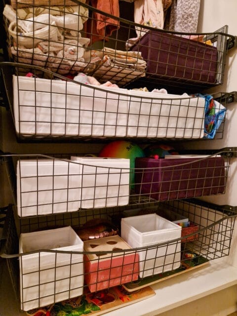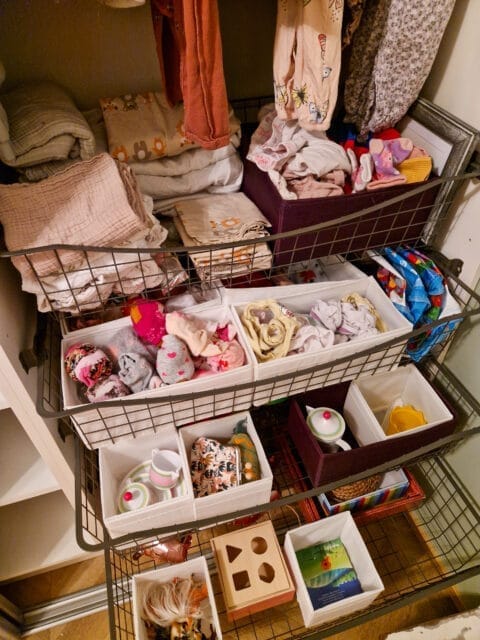 Halusin, että peilikaappi olisi kätevä ja käytännöllinen sekä vastaisi tarpeitamme. Halusin, että myös isikin löytää lasten vaatteet sieltä helposti ilman, että tarvitsee räjäyttää kaikki hyllyt aamun kiireessä. Löysin kaappiin täydellisen ratkaisun! Siis oikeasti aivan täydellisen, nimittäin Helatukun Norscan Roller-korit! Muutaman kuukauden käytön jälkeen voin todeta, että tämä oli yksi parhaita ratkaisuja arjen toimivuuden kannalta koko remontissa. Lasten vaatehyllyt ovat säilyneet siistinä, oikean vaatteen löytää heti ja kaikilla on paikkansa! Alemmat korit ovat leluja varten ja ylemmät vaatteita ja lasten lakanoita varten. Korit rullaavat kevyesti, joten kaksivuotiaan tyttäreni on helppo ottaa haluamansa lelut esiin ja ylimääräistä hyllyä tai kaappia lelujen säilytykseen ei tarvita. Vaatekoreissa on kaksi välijakajaa, joten ne kätkevät sisäänsä ihan hurjan määrän pieniä vaatteita. Vaatteet näkee yhdellä silmäyksellä, kun ne on viikattu pystyyn. Vaatepinot pysyvät jakajien ansioista hyvin paikoillaan enkä ole kertaakaan joutunut järjestämään vaatteita uudelleen kotiin muuttomme jälkeen. Oikeasti, ihan mielettömän toimiva systeemi, jonka haaveilen saavani seuraavaksi meidän aikuisten vaatehuoneeseen, joka on ihan pommi koko ajan.