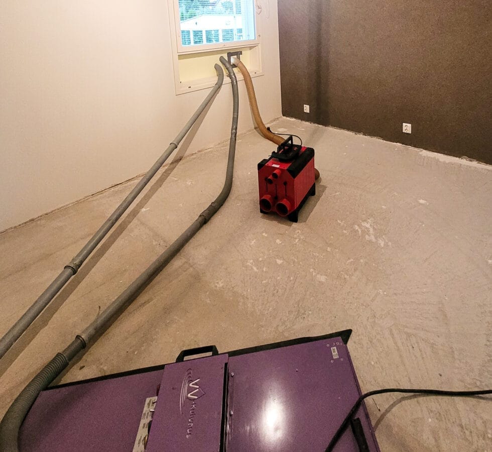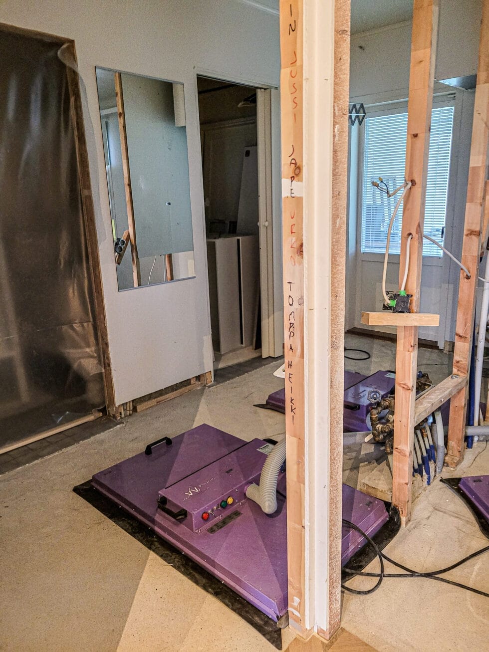 Vakuutusyhtiön päätöksen jälkeen saimme valita, että kenen haluamme suorittavan remontin loppuun ja halusimme ehdottomasti jatkaa VV-Kuivauksen kanssa. Heiltä olin saanut nopeasti apua tilanteen ollessa akuutti ja asiat selitettiin niin, että maallikkokin ymmärsi, että mistä on kysymys. Lisäksi tiesin heidän olevan iso, paikallinen toimija, joten oli helppo jatkaa yhteistyötä heidän kanssaan. Eipä mennyt aikaakaan, kun heiltä tuli purkumies purkamaan vaurioituneet rakenteet ja tehokkaat kuivaimet oli asennettu kuivamaan kastuneita alueita.