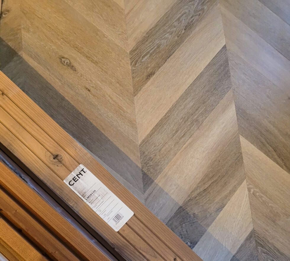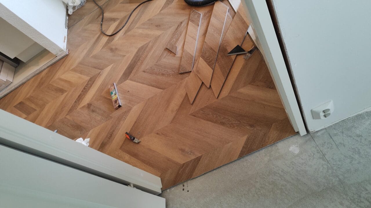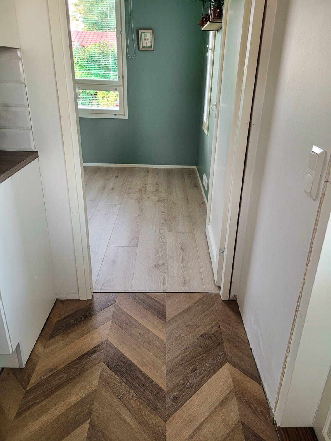 Kotimme on ollut alun perin hyvin vaaleansävyinen tai valkoinen. Olemme pikkuhiljaa jo aiemmin tuoneet sinne lisää värejä rakentamalla eteisen ja olohuoneen väliin tummanvihreän väliseinän hirsipaneelista, maalaamalla lastenhuoneen mintunvihreällä, tekemällä sormipaneelista tehosteseinän kodinhoitohuoneeseen sekä toteuttamalla makuuhuoneeseen tumman päätyseinän Tikkurilan kivi-maalilla. Nyt, kun lattia meni melkein koko huushollista uusiksi, niin päätimme omakustanteisesti laajentaa lattian vaihtamisen koko taloon. Olimme asuntomessuilla ihastuneet kalanruotolattiaan ja kerran kun saa päähänsä jonkinlaisen vision, niin siitä on hyvin hankala päästää irti. Siispä valintamme oli kalanruotolattia, vaikka sen asentamiseen upposi enemmän työtunteja kuin tavalliseen lattiaan, joka itsessään lisäsi kustannusten määrää. Tässä meitä helpotti tieto, että VV-Kuivauksen erittäin taitava timpuri oli asentanut niitä ennenkin ja lopputulos on ihan täydellisen hieno! Hän on tehnyt niin tarkkaa työtä, että emme olisi voineet unelmoida paremmasta!