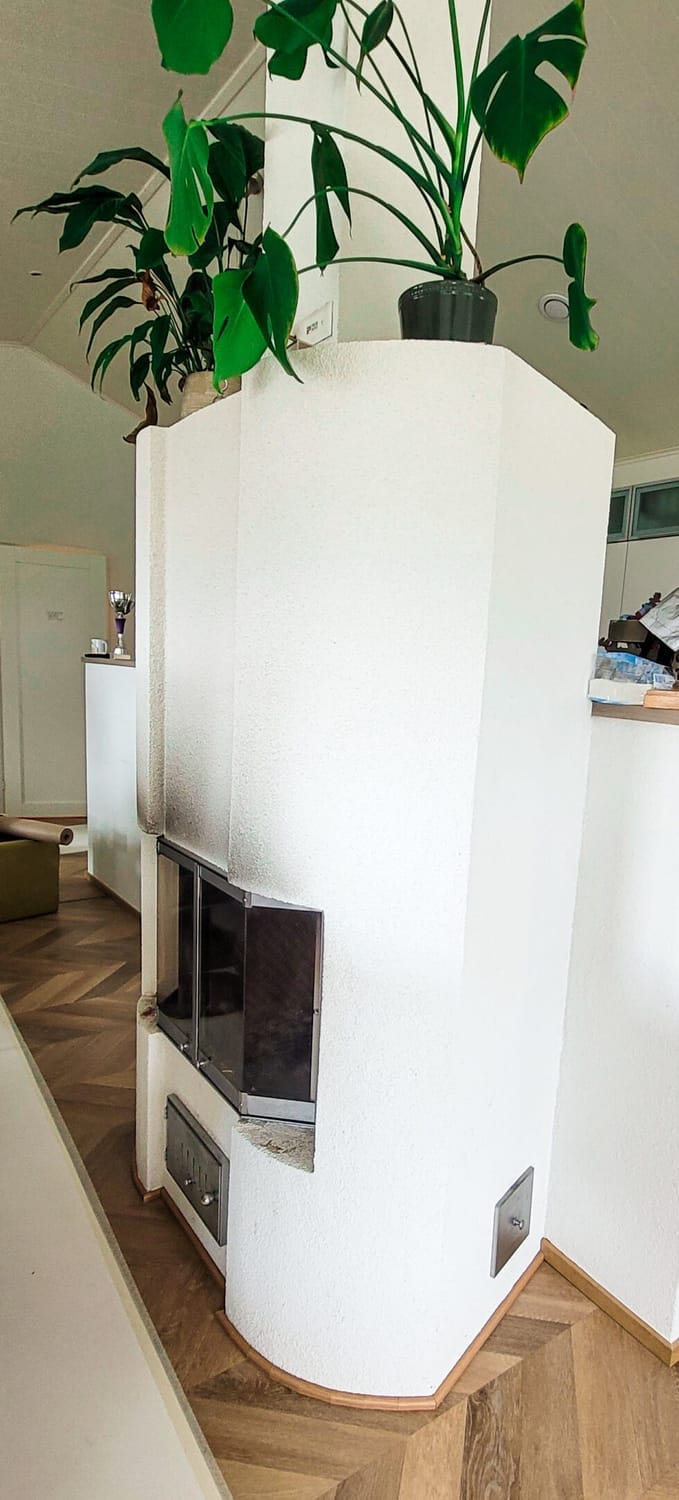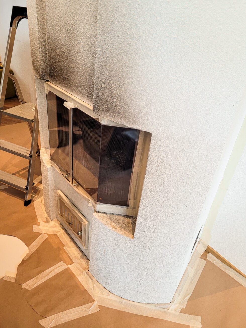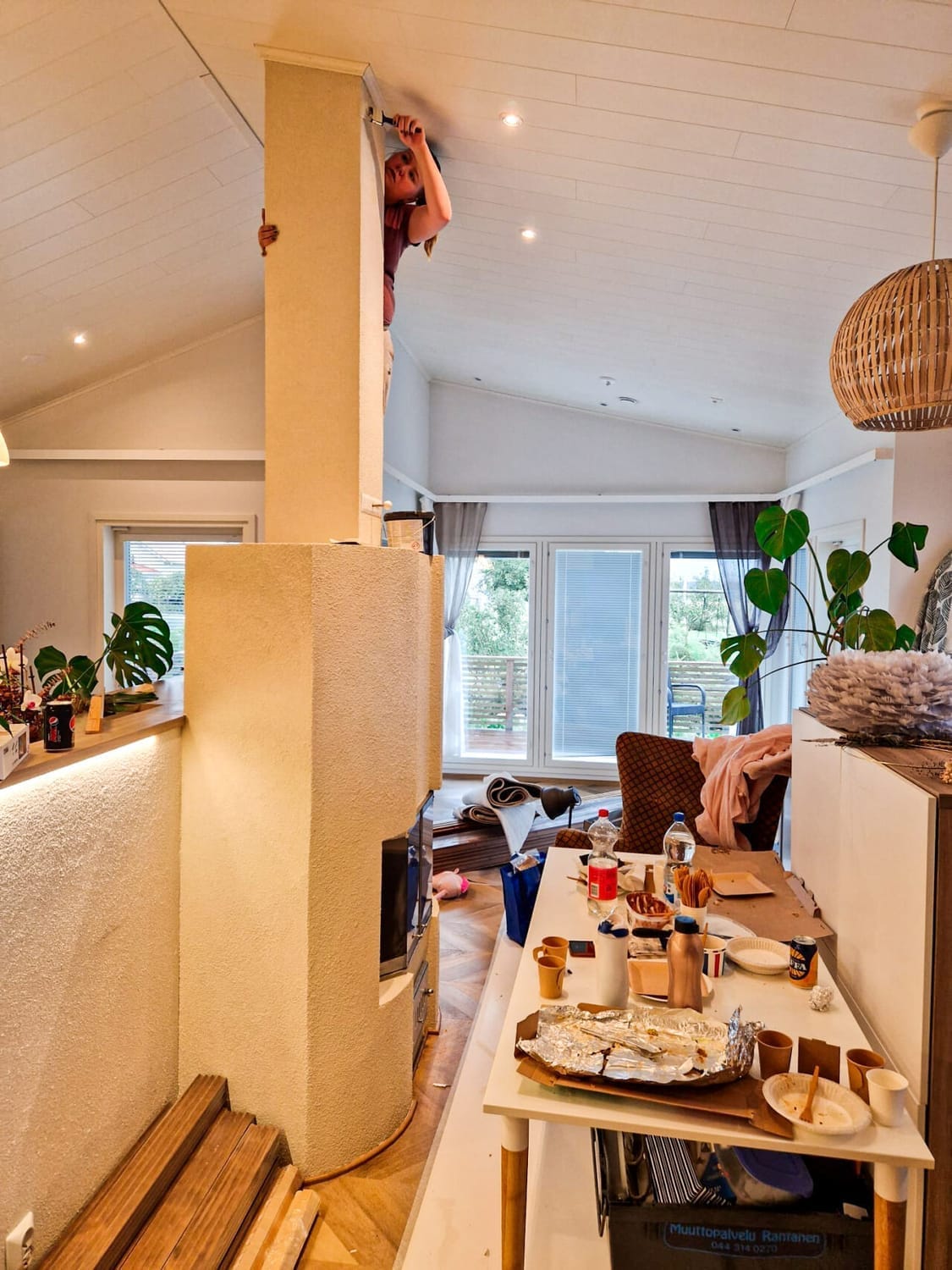 Yksityiskohdat ratkaisevat monessakin asiassa ja yksi pieni, mutta itselleni iso asia oli meidän varaava takka. Se on alkuperäiseltä sävyltään ollut valkoinen ja sittemmin se oli muuttunut mustan, valkoisen ja harmaan sekaiseksi yhdistelmäksi. Sitä ei pystynyt oikein pesemään, koska pinta on rapattu. Lisäksi takkaluukun ”hyllyillä” oli steariinitahroja. Mietin pitkään, että pitäisikö takka maalata nyt, kun kerran on mahdollista. Mieheni mukaan ei kannata ja minusta kannatti, joten arvannet, että mihin päädyttiin? Minä maalasin ja mieheni vikisi (ja maksoi maalin)! 😊 Mielestäni lopputulos on huippupaljon parempi kuin aiemmin! Maalasin takan yhden kerran Tikkurilan Muuri-maalilla sävyllä tofu. Ja mitä niihin yksityiskohtiin tulee, niin katsokaapa kuvasta, miten upeasti VV-Kuivauksen timpuri listoitti takan alareunan. Lopputuloksesta tuli todella hieno! Viralliset ennen ja jälkeen-kuvat tulee seuraavassa postauksessa!