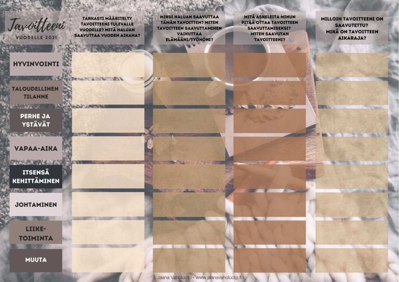 Aloitetaan tavoitteiden laatimisesta. Halusin auttaa sinua saamaan itsellesi selkeän kuvan tavoitteistasi ja rakensin sinulle tällaisen tavoitetaulukon, jonka voit tulostaa tästä: TAVOITETAULUKKO. Voit toki täyttää sen myös tietokoneella tai vastata samoihin kuvan mukaisiin kysymyksiin mille tahansa paperille tai vihkoon. Toivottavasti tämä taulukko selkeyttää ajatuksiasi. Vastaamistilaa ei ole kovin paljon, joten voit halutessasi täydentää vastauksiasi esimerkiksi paperin taakse. Mikäli taulukossa on sellaisia kohtia, jotka eivät koske sinua, niin voit hypätä niiden yli.