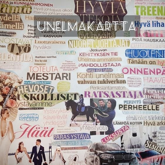 No toimiiko unelmakartan teko? En tiedä, että mikä toimi, mutta ainakin kaikki haaveeni siitä toteutui. Alitajunta ohjaa meidän kaikkea tekemistä ja on huomattavasti vahvempi kuin osaamme edes ajatella. Mitä sinun alitajuntasi sanoo sinulle? Auttaako se sinua saavuttamaan unelmasi vai estääkö se sinua? Kokeile tehdä unelmistasi kartta. Ei se yksin ihmeitä tee, mutta sen avulla alitajuntasi saa uutta työstettävää siitä mitä todella haluat.