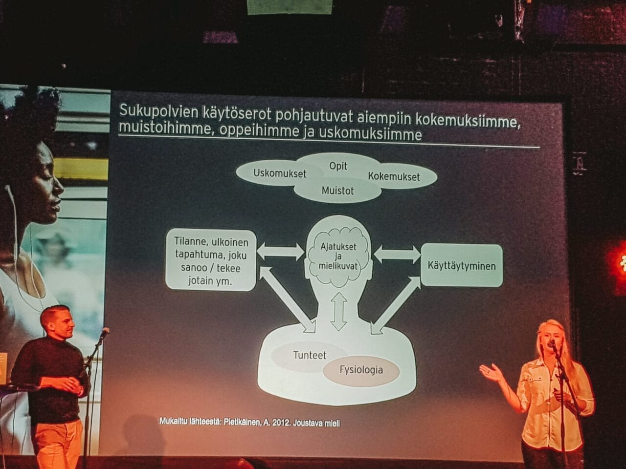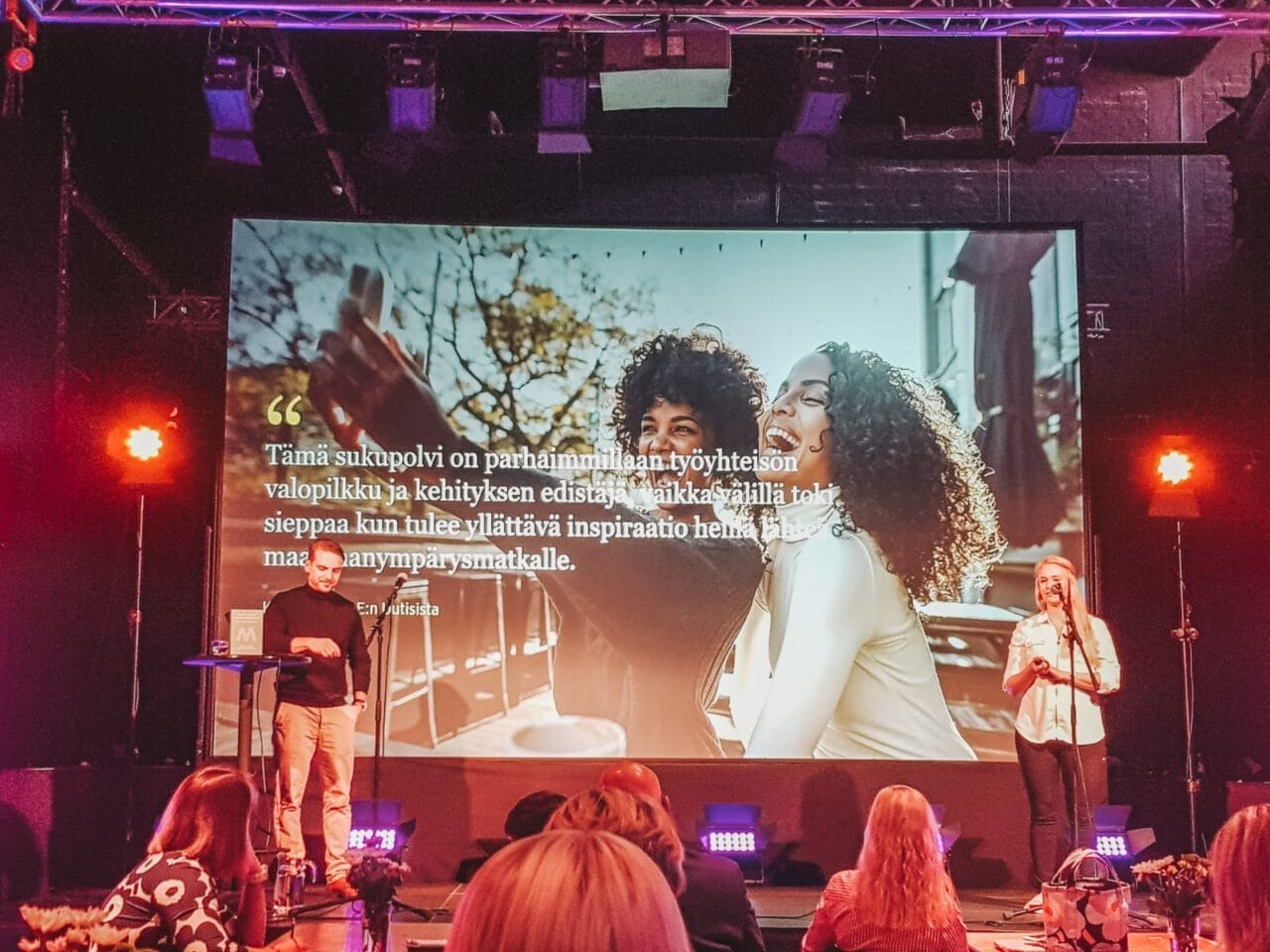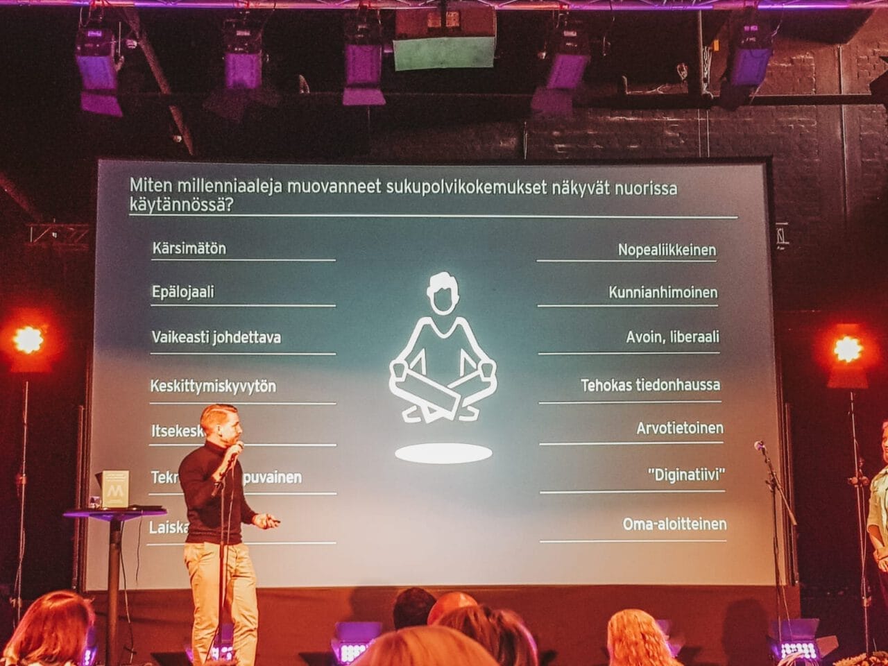 Milleniaalien sukupolvea ohjaavat neljä merkittävää kokemusta, jotka ovat erilaisia kuin aiempien sukupolvien kokemukset. Me olemme kasvaneet taloudellisesti huomattavasti turvatuimmissa olosuhteissa kuin vaikka muutama sukupolvi meitä vanhemmat ihmiset. Maslowin tarvehierarkian alimpien askeleiden tarpeet ovat meidän sukupolvella täytetty, joten ikäiseni etsivät enemmänkin itseään miellyttävää ja aidosti innostavaa työtä kuin mitä tahansa elantoa laskujen maksamiseen. Se näkyy lisääntyvänä työpaikkojen vaihtamisena ja oman polkunsa etsimisenä. Lisäksi meidän aikuistumisen aikana on tullut uudet teknologiat käyttöön sekä somen tuoma maailma. Olemme hyvin kärsimätöntä kansaa ja olemme tottuneet saaman kaiken heti nyt. Kaikkeen on olemassa applikaatio, kuten Tatu Mellanen puheessaan sanoi. Jos haluat katsoa leffan, ei tarvitse mennä Makuuniin, vaan voit katsoa sen Netflixstä. Jos haluat uudet kengät, sen kuin klikkkaat itsesi Zalandoon. Kirjoja ei tarvitse ostaa eikä lainata, kunhan lataa Storytellin tai BookBeatin. Itseasissa uuden puolisonkaan metsästämiseksi ei tarvitse poistua kotoa. Lataa vain tinder ja swaippaa oikealle!