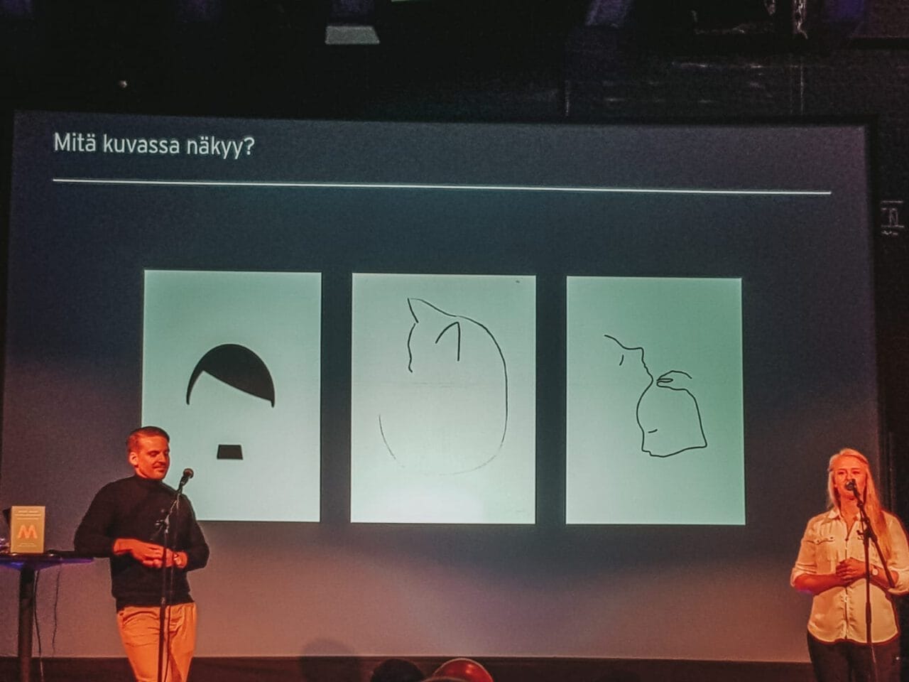 Kun katsot yllä olevia kuvia, niin mitä näet? Tämä kysymys kysyttiin meiltä yleisöltä. Toiset näkivät naisen, toiset näkivät miehen, toiset näkivät seuraavassa kuvassa kissan, toiset emon ja kolmannessa halaukset äidin ja lapsen välillä, kun taas toiset näkivät intohimoisen kohtaamisen kahden aikuisen kesken. Kun saamme ääriviivat, niin mielemme täyttää aukot kyllä itse. Se miten aivomme ne täyttää, riippuu täysin omasta historiastamme, kokemuksistamme ja ajatuksistamme.