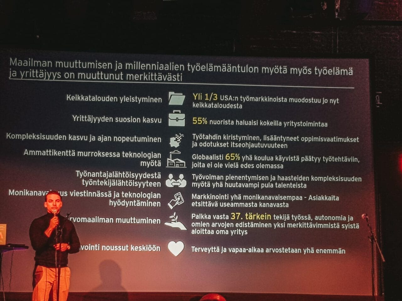 Keikkatalous on koko ajan suositumpaa ja yli kolmasosa USA:n työmarkkinoista muodostuu jo siitä. Yrittäjyyden suosio on kasvanut räjähdysmäisesti nuorten keskuudessa. Vuonna 1995 tehdyn tutkimuksen mukaan 2 % vastaajista haaveili perustavansa yrityksen seuraavan 5 vuoden aikana ja 18 % oli jokseenkin kiinnostunut yrittämisestä. Tänä päivänä tehdyssä tutkimuksessa 55 % nuorista haluaa kokeilla yrittämistä. Maailma ja varsinkin työmaailma ovat muuttuneet. Milleniaalien arvomaailma on erilainen. Esimerkki palkka on vasta 37. tärkein tekijä, kun he miettivät missä haluavat tehdä töitä. Ehkä he juuri siksi ovatkin potentiaalisia yrittäjiä ;)? No vitsit vitsinä.
