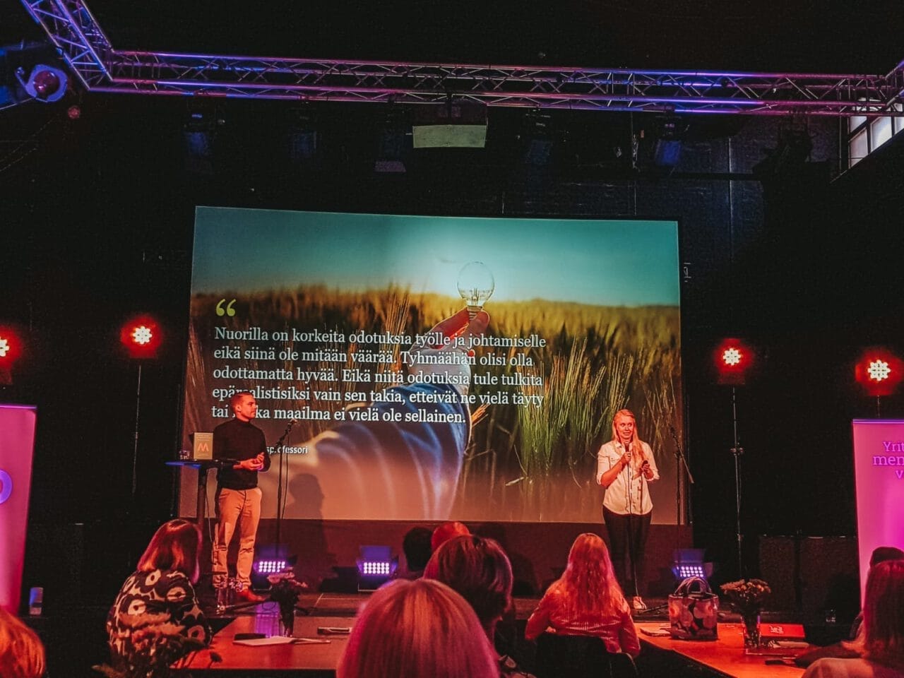 ”Hyvät, pahat ja milleniaalit” oli aiheena tämän päivän Into Seinäjoen järjestämässä tilaisuudessa. Aihe osui ja upposi, koska minä itse kuulun henkilökohtaisesti tähän ”nuorisoon” eli niin sanottuihin milleniaaleihin. Puhumassa olivat Karoliina ja Atte Mellanen, jotka ovat tutkineet milleniaalien eli 1980–2000 syntyneiden johtamista ja ovat kirjoittaneet aiheesta myös kirjan. Heidän alkuslideihin oli napattu hyvin virke, joka kuvailee varmasti oman ikäpolveni ihmisiä hyvin: ”Tämä sukupolvi on parhaimmillaan työyhteisön valopilkku ja edistäjä, vaikka välillä toki sieppaa, kun heillä tulee yllättävä inspiraatio lähteä maailmanympärimatkalle.”