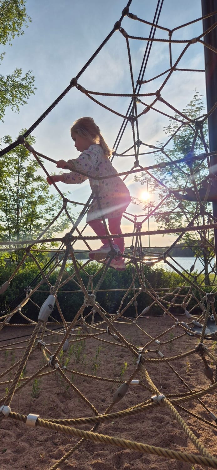 Lootholmassa on myös vierasvenesatama, jonka vieressä on ravintola ja leikkipuisto. Toinen leikkipuisto sijaitsi lähellä vaunupaikkaamme. Ajatuksenamme oli käydä ravintolassa illallisella, mutta hetken käyskentelyn, leikkimisen ja saunan jälkeen olimme kaikki sen verta poikki, että päätimme tehdä illallisen nuotiopaikalla. Asuntoautoilussa ihan parasta on se, että suunnitelmat joustaa tarpeiden mukaan. Vältyttiin turhalta komentamiselta ja hermojen kiristelyltä, kun väsyneitä lapsia ei tarvinnut yrittää viihdyttää ravintolapöydässä. Sen sijaan he saivat leikkiä leikkipaikalla ruoan valmistumisen ajan – ja koko perheen hyvä fiilis säilyi huomattavasti helpommin.