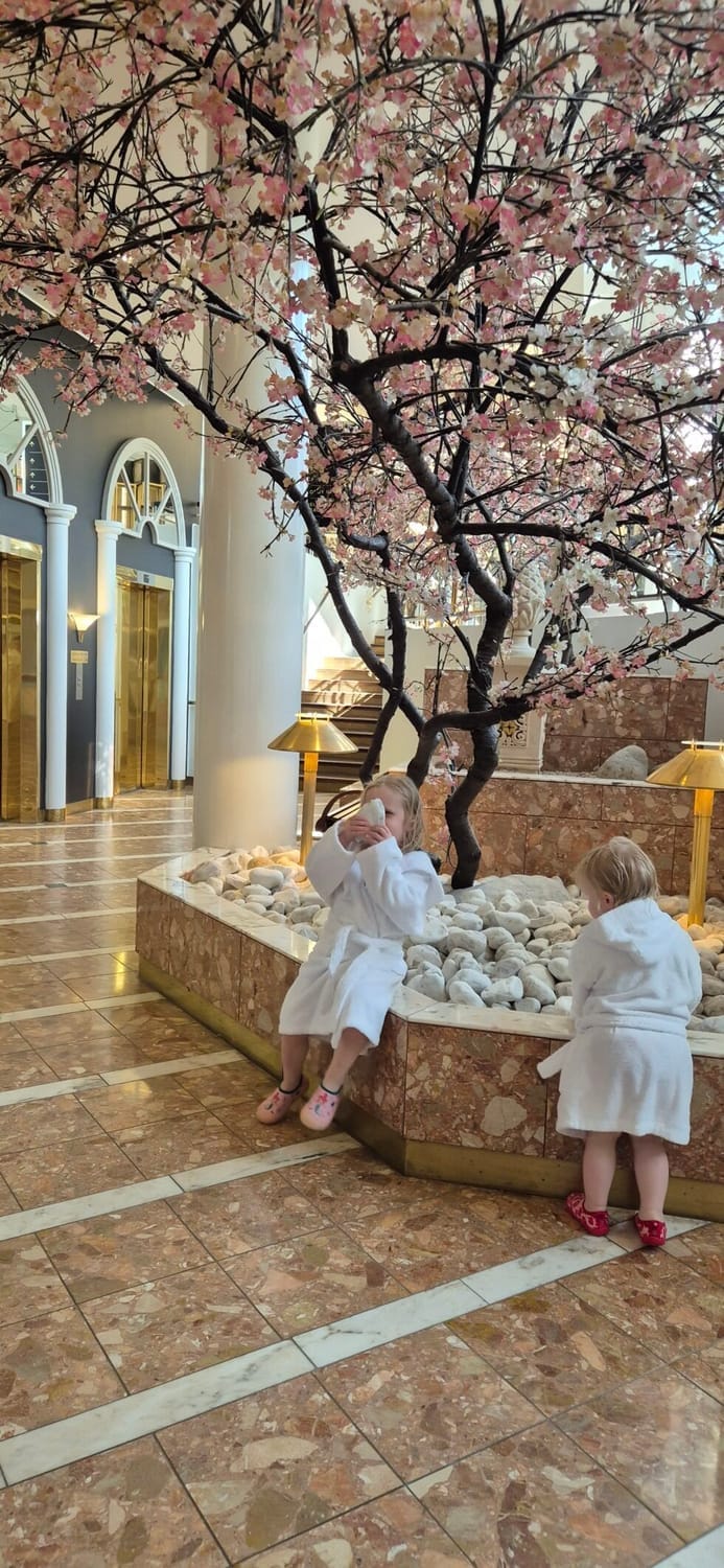 Naantali Spa:n aula oli yhtä upea ilmestys kuin aiemmin. Suureksi pettymyksemme hotellin sivuilla lukikin, että Thai Garden-ravintola olisi suljettuna koko viikon, eikä vastaanotossakaan tähän osattu sanoa syytä. Hetken nieleskelin ärsyyntymistäni, mutta se jäi onneksi nopeasti taka-alalle, kun pääsimme lasten kanssa kylpylään. Kylpylä ei ole paras mahdollinen pienille lapsille, sillä siellä ei ole ollenkaan lastenallasta, vaikka ihan siisti ja tunnelmallinen onkin. Hotellihuoneemme oli iso ja siisti, mutta sisustus oli parhaimmat aikansa jo ohittanut. Pisteet kuitenkin kivasta leikkialueesta aivan hotellihuoneemme vieressä.