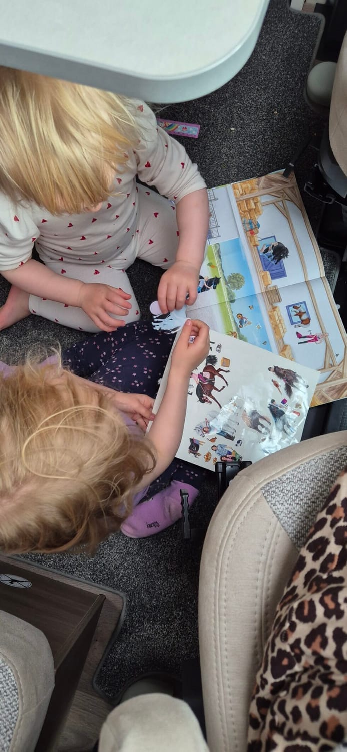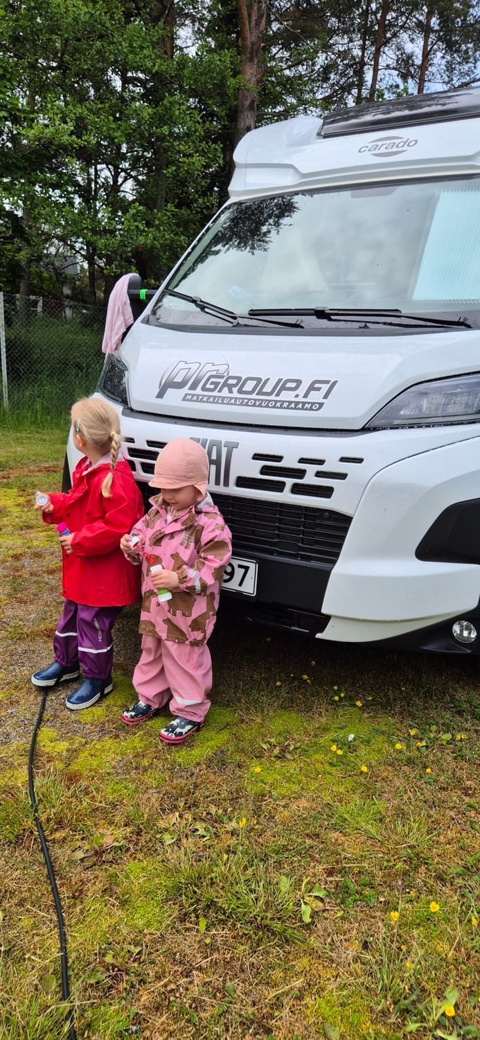 Fiilis oli kuin lapsella jouluna odottaessani miestäni kotiin asuntoauton kanssa. Minä pakkailin lasten tavaroita, kun hän lähti hakemaan autoa Ylihärmästä. Oman auton sai jättää heille veloituksetta, mikä helpotti, kun ei tarvittu kahta ihmistä hakemaan autoa. Juha sai hyvät ohjeet auton käsittelyyn ja perhoset lenteli vatsassa, kun hän kaarsi upean, aivan uuden asuntoauton pihaamme! Auto oli meille aivan täydellinen! Juuri sopivan kokoinen meidän nelihenkiselle perheelle. Kyseessä oli Carado T448 mallin auto. Autosta löytyi kaksi isofix-kiinnitystä, joten saimme näppärästi tyttöjen omat istuimet kiinni autoon. Autossa oli paljon säilytystilaa, erittäin leveä sänky (215 x 210cm), yläsänky mahdollisuus, kattava keittiö tarvikkeineen, WC ja suihku, ruokapöytä sekä kattavasti tilaa tavaroille isossa takatallissa. Pakkasimme auton nopeasti ja lähdimme hakemaan lapsia hoidosta autolla. Heidän ilmeensä olivat näkemisen arvoiset, kun he pääsivät lähtemään lomareissulle suoraan hoidosta!