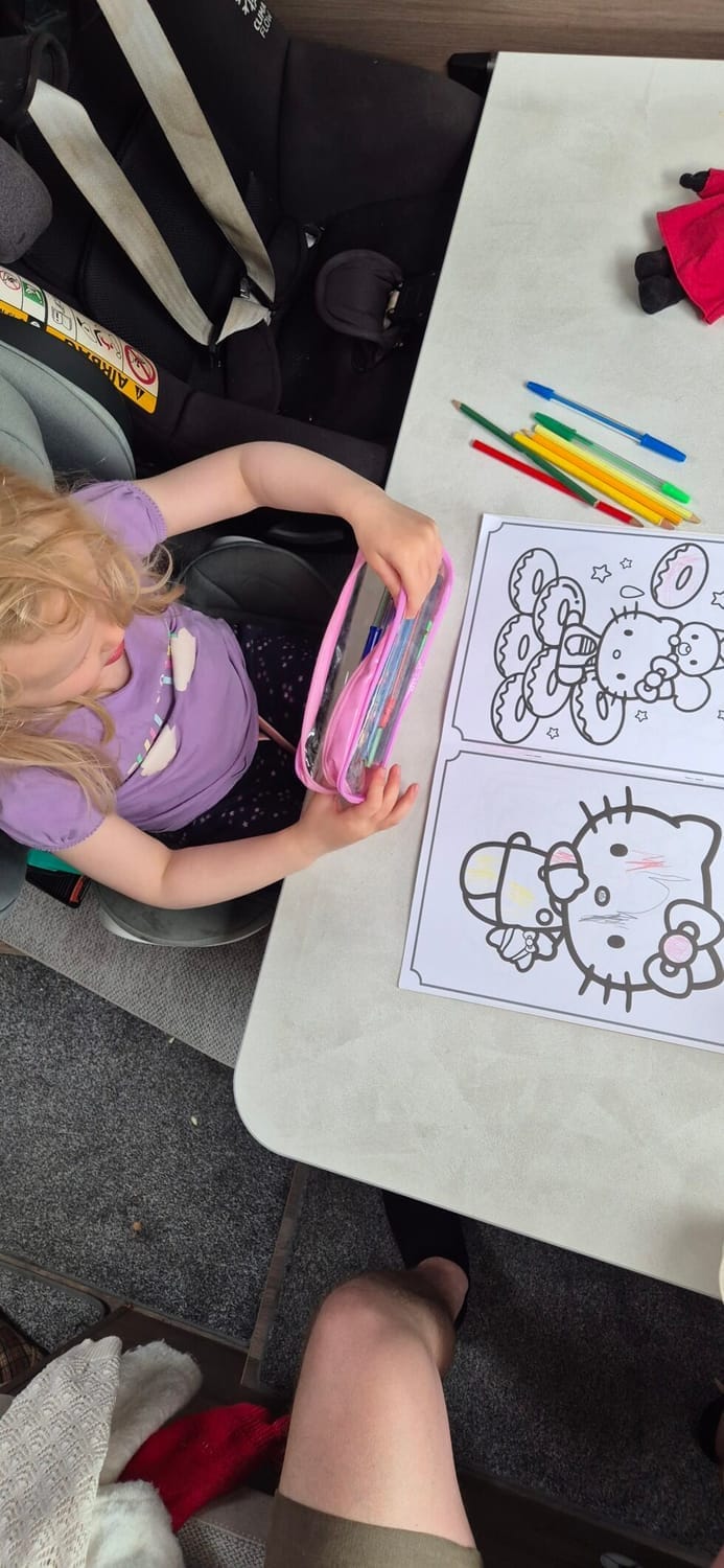 Pakkaa lapsille tekemistä. Meillä oli mukana värityskirjat ja kynät sekä siirtotarrakirjat, joista riitti iloa pitkäksi aikaa.