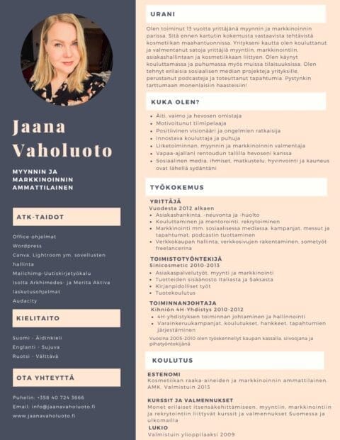 Olen toiminut yrittäjänä vuodesta 2011 saakka ja työllistänyt itseni päätoimisesti 2014 alusta lähtien. Olen rakentanut urallani nollasta lähes miljoonan euron liikevaihtoa vuodessa tehneen myyntitiimin yhteistyössä maailman suurimman Aloe Vera-tuotteiden viljelijän ja jakelijan, Forever Living Productsin kanssa. Työtehtäviini on kuulunut mm. myynti- ja markkinointityöt, kouluttaminen ja valmentaminen, rekrytointi, tapahtumien järjestäminen ja tietenkin kaikki kirjanpitoon ja logistiikkaan liittyvät työtehtävät.